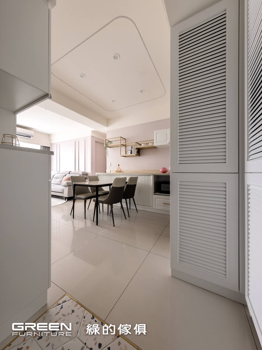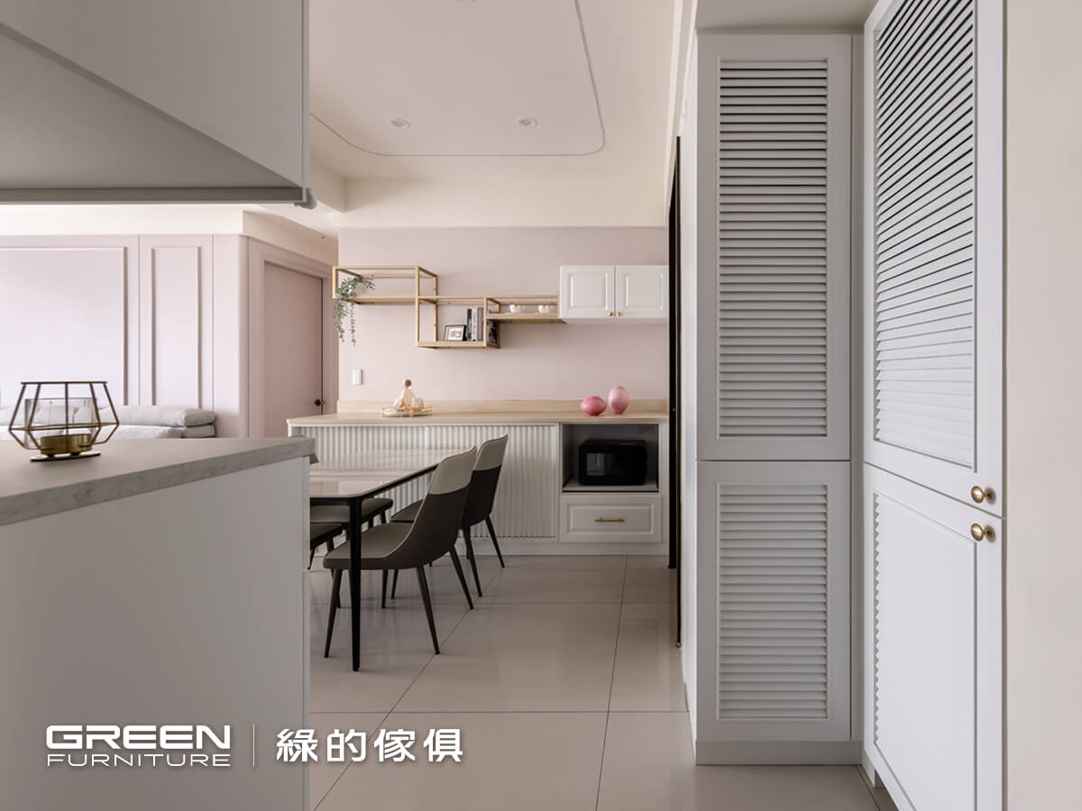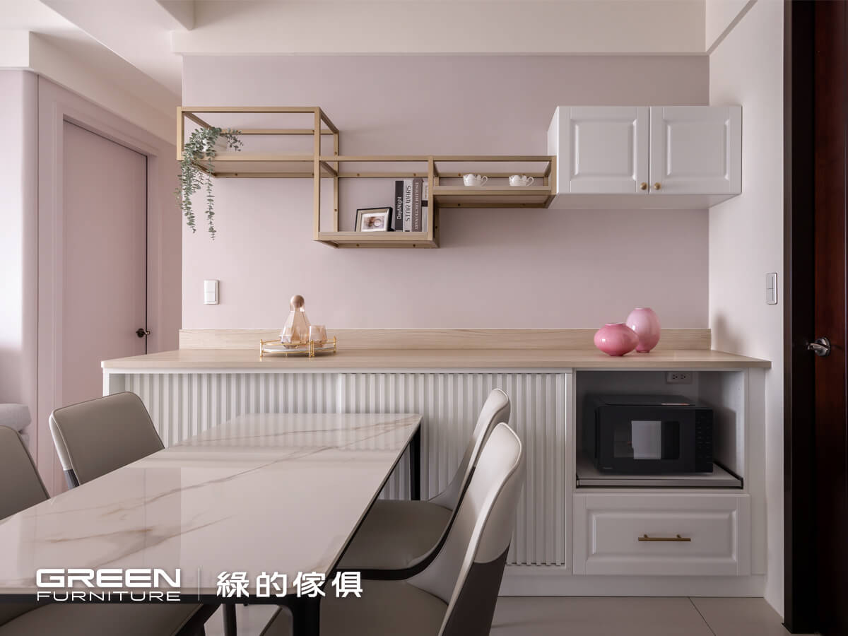 白詮打造的餐櫃檯面,延續輕奢元素。考量到使用的便利性,設計師搭配白色格柵推拉門,左右皆可使用,不會受限於餐桌的位置。餐櫃上方牆面金色魔術方管倚著白色懸吊櫃搭建,沒有過多的修飾,在瑰蜜粉牆面的襯托下,盡現自由的跳躍感,恣意展現它美麗的線條。