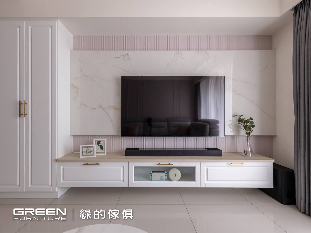 客廳的電視牆以大理石紋大板磚為主體,上下方則以瑰蜜粉密集板裝飾,塑造猶似格柵的效果。搭配以白詮與白色陶瓷烤漆組成的懸吊式電視櫃,在上下燈源的光影變化下,底部反射出來的金黃色光源與大板磚透出的金色紋理,默契十足地與室內點綴的金色元素相呼應,不管白天或黑夜,帶來同樣溫潤的明亮與柔美。
