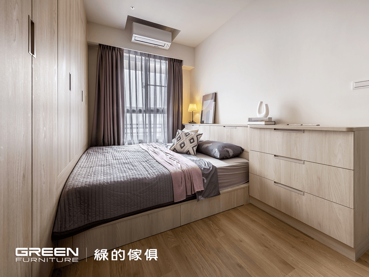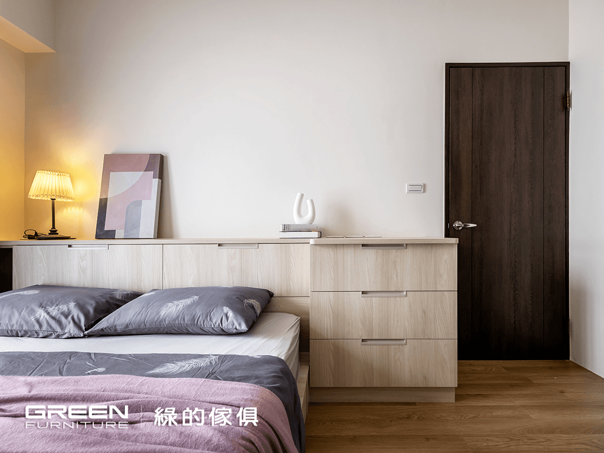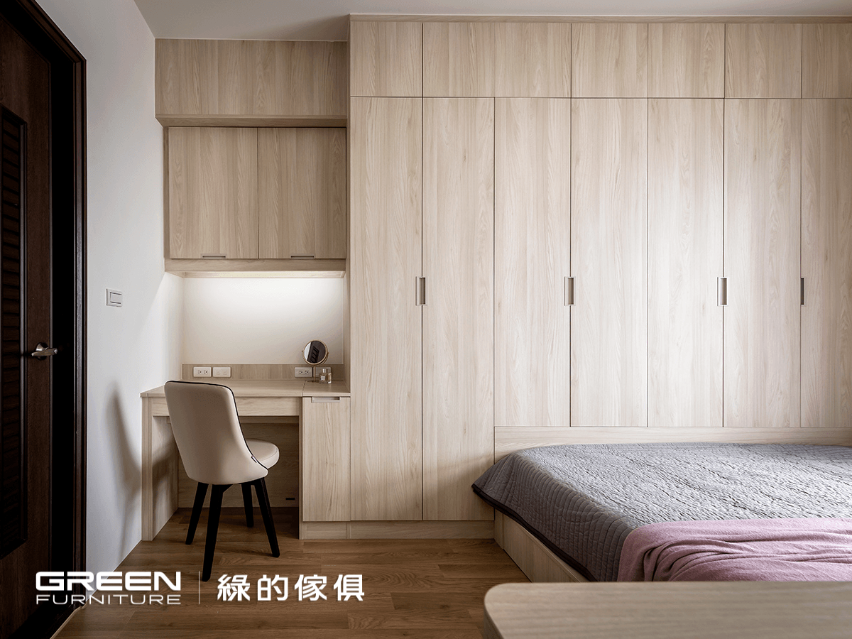 沿襲同色的設計,衣櫃以懸掛衣物為主,上方以按壓式櫃門將結構樑包覆,同時提供額外的收納空間。床頭的下掀櫃與側邊的斗櫃,解決一年四季的收納煩惱,舉凡厚重的棉被及換季衣物通通搞定,側邊平台加長的延伸設計更可兼具熨燙,大幅提升使用機能。