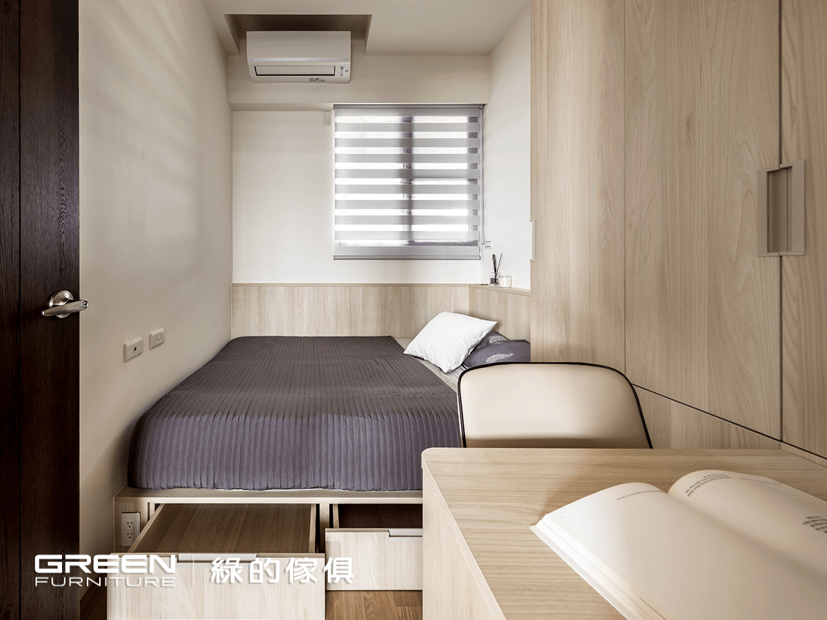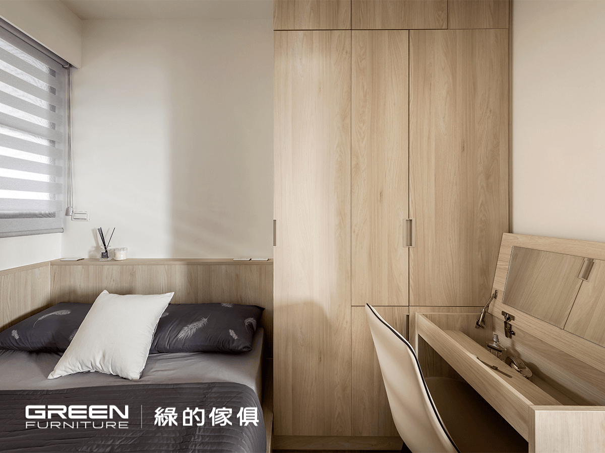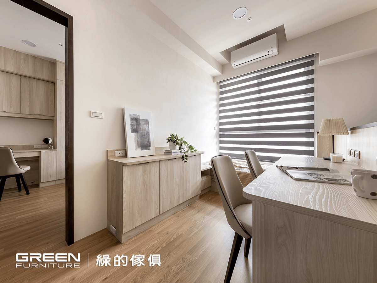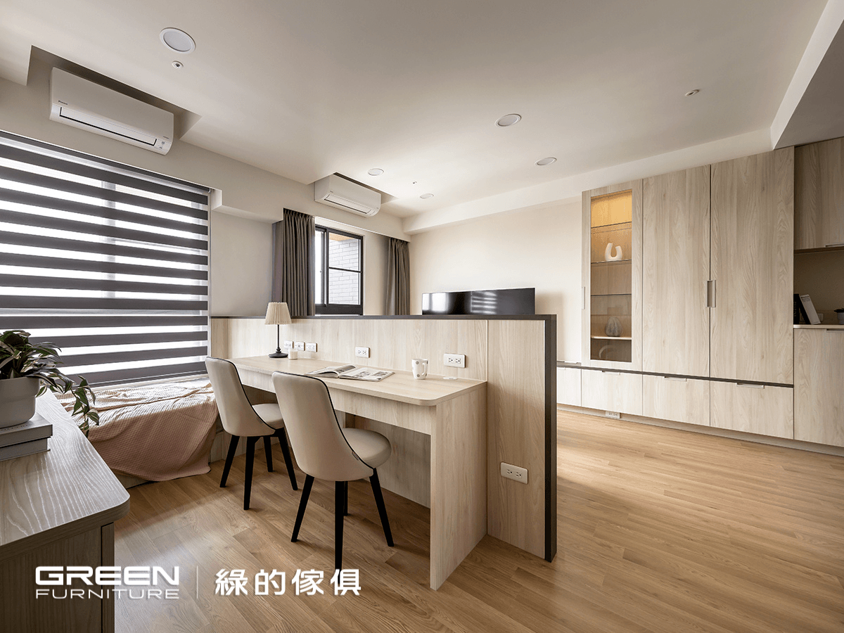 沙發背牆後延伸出開放式多功能空間,讓小坪數輕裝潢不受單一機能侷限。書桌配置安全且足量插座,搭配淺木紋系統板與金色修飾條,為室內設計增添溫潤暖意。書桌後方整合功能齊全的系統櫥櫃,可擺放多功能事務機,書房可靈活轉為居家辦公,貼合現代生活節奏。書桌緊鄰臥榻並加設護牆,兼顧休憩與安全,也讓客廳裝潢向後延伸出更豐富的生活層次。透過系統傢俱整合與精準比例,綠的傢俱讓小坪數空間高效利用,兼具耐用與舒適。