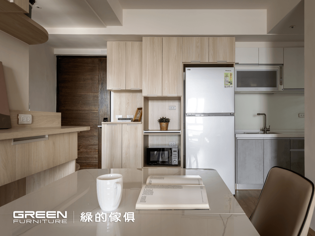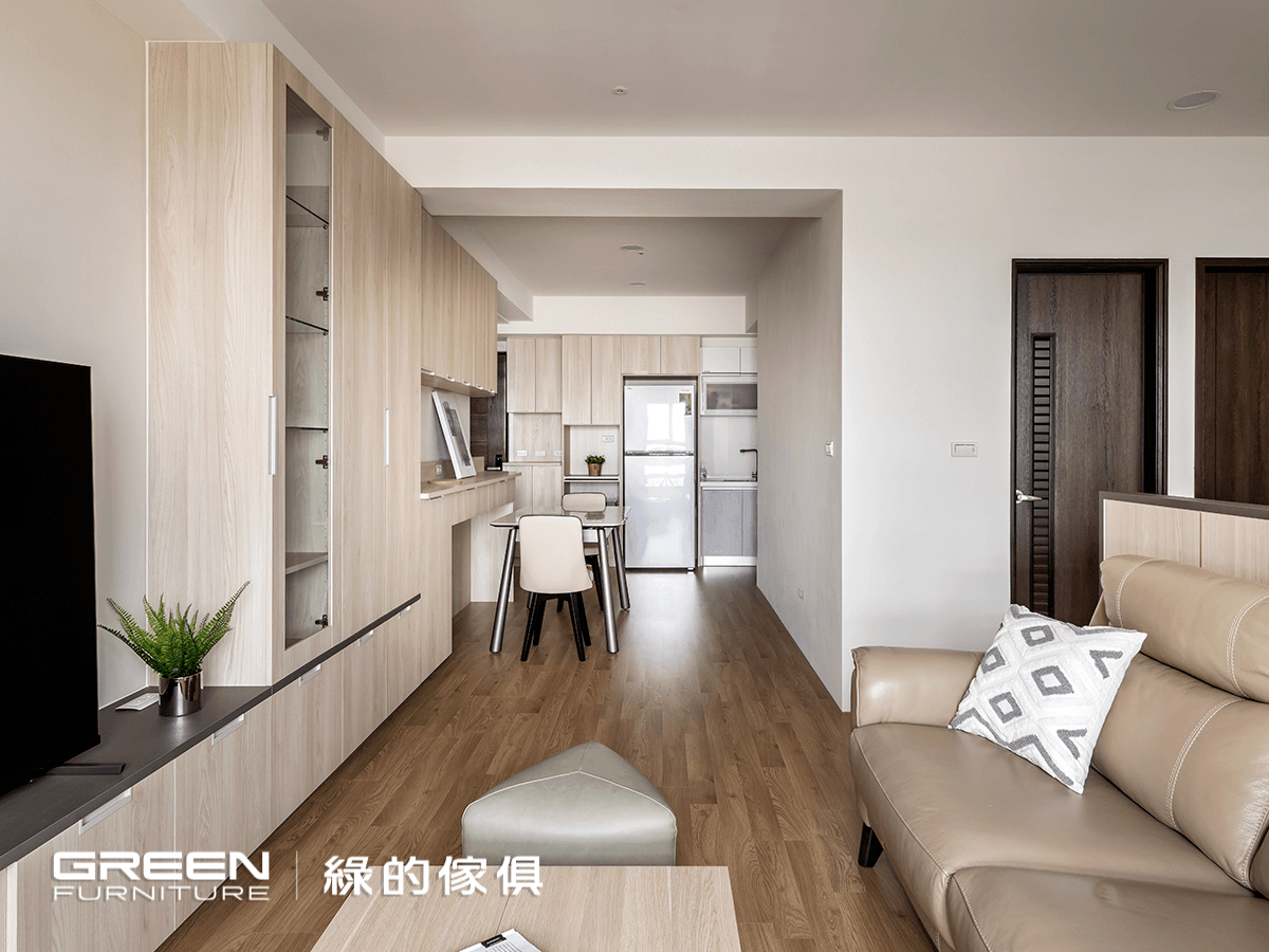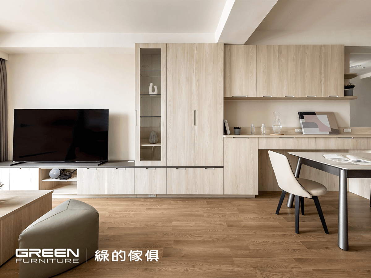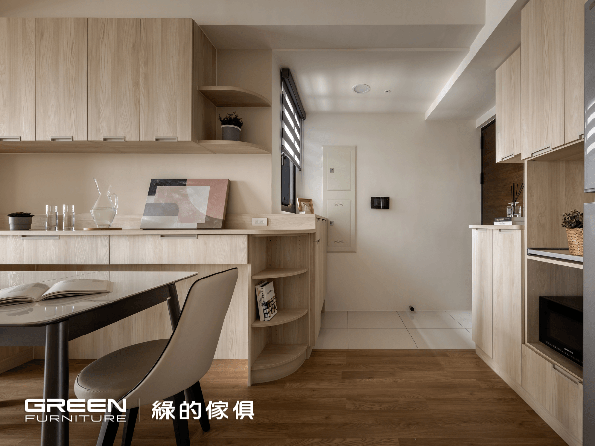 轉角開放式設計搭配圓弧櫃體,自然引導動線並放大行走寬度,上櫃局部開放、中段簍空可放置小家電,下櫃抽屜刻意與上櫃保留落差,兼顧櫃體耐用與使用安全,下方留白則讓餐桌可內推收納,進一步提升走道彈性;搭配耐高溫且易清潔的斯卡拉白岩板伸縮餐桌,讓餐廳機能能依生活需求彈性調整。緊鄰電視牆的清玻展示櫃延伸了視線,奶油色牆面在一片木質基調中顯得柔和安定,鈦絲褐電視櫃檯面則成為低調卻有份量的視覺焦點;在這樣的小坪數室內設計中,透過系統傢俱的整合與留白思維,綠的傢俱讓空間不追求堆疊,而是回歸好住、耐看、越住越順的日常。