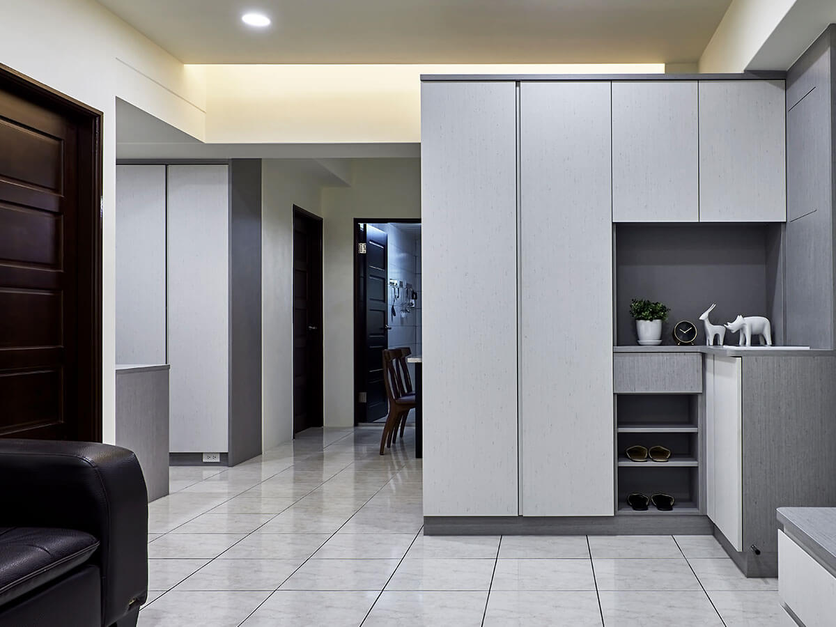 一進門的公共空間以百搭的灰、白色來做空間的主軸色調,讓忙了一整天返回的家人能夠放鬆心情,大量收納櫃足可收拾、分類生活用品,同時還多出了書房的空間,整個家的「雜物間」消失無形,被更大的空間效益取代。