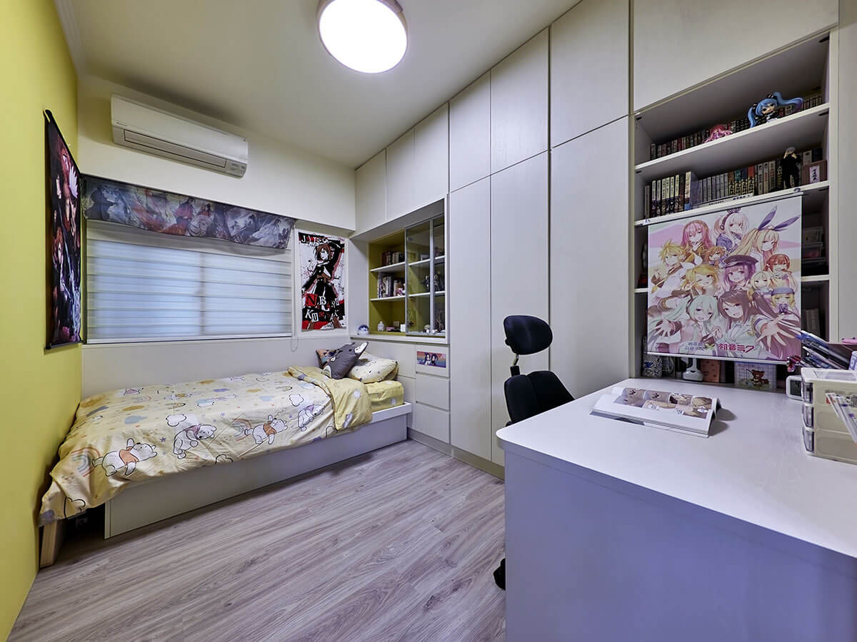 就讀高中美工科的女兒具有獨特的美感要求,整面牆選用同屬無毒無味的黃色塗料,白色衣櫃也有黃色的隔板作呼應,穿衣鏡就藏在衣櫃門內,書桌的一端穿進開放式櫃位,在家做作業更有空間可放各式工具,得心應手。