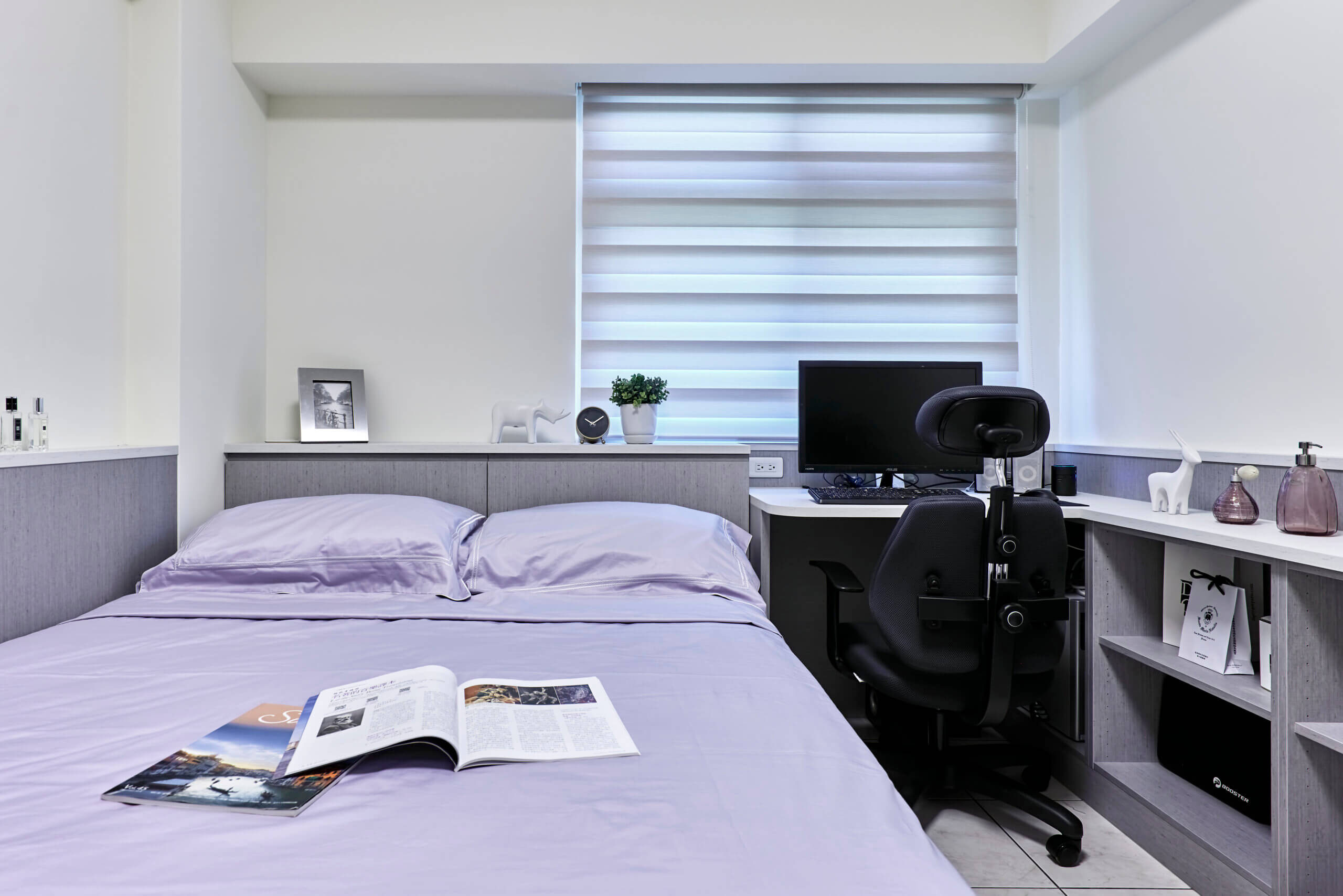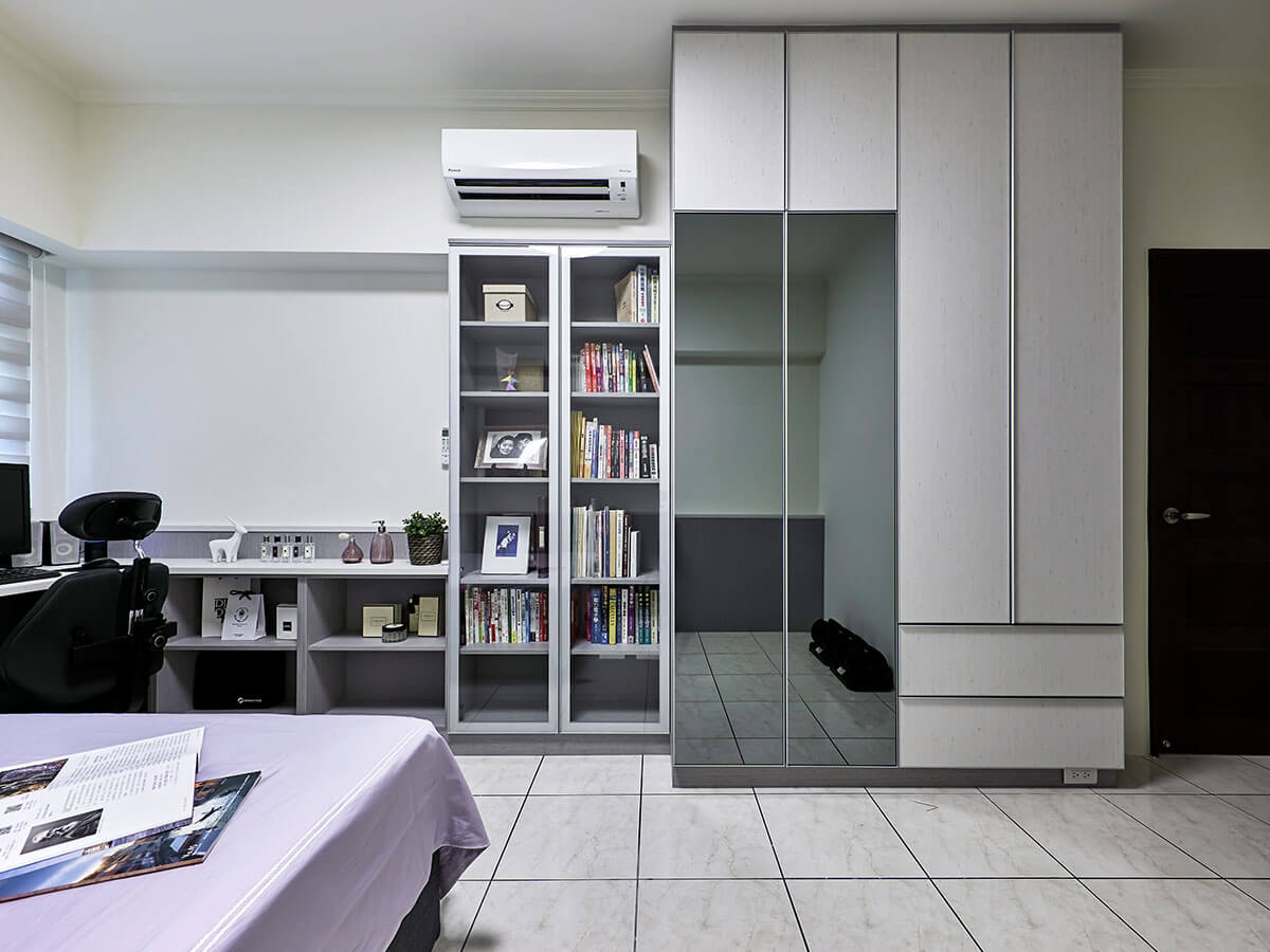 進門的右手邊是一整組靠牆聳立的衣櫃,表面貼有穿衣鏡方便穿搭調整,往裡頭是設有玻璃門的書櫃、格層式的短櫃,左轉電腦桌,緊鄰到床,床後頭是可供儲放棉被的褐色深櫃,櫃檯上能讓主人隨手放下眼鏡等物品,設想周到,而在床的靠牆面,設計師也立起同色的長方板材,視覺美感有一致性。另外,設計師在房門後的畸零空間刻意打造一件單櫃,上下兩大格,安放行李箱恰恰好。