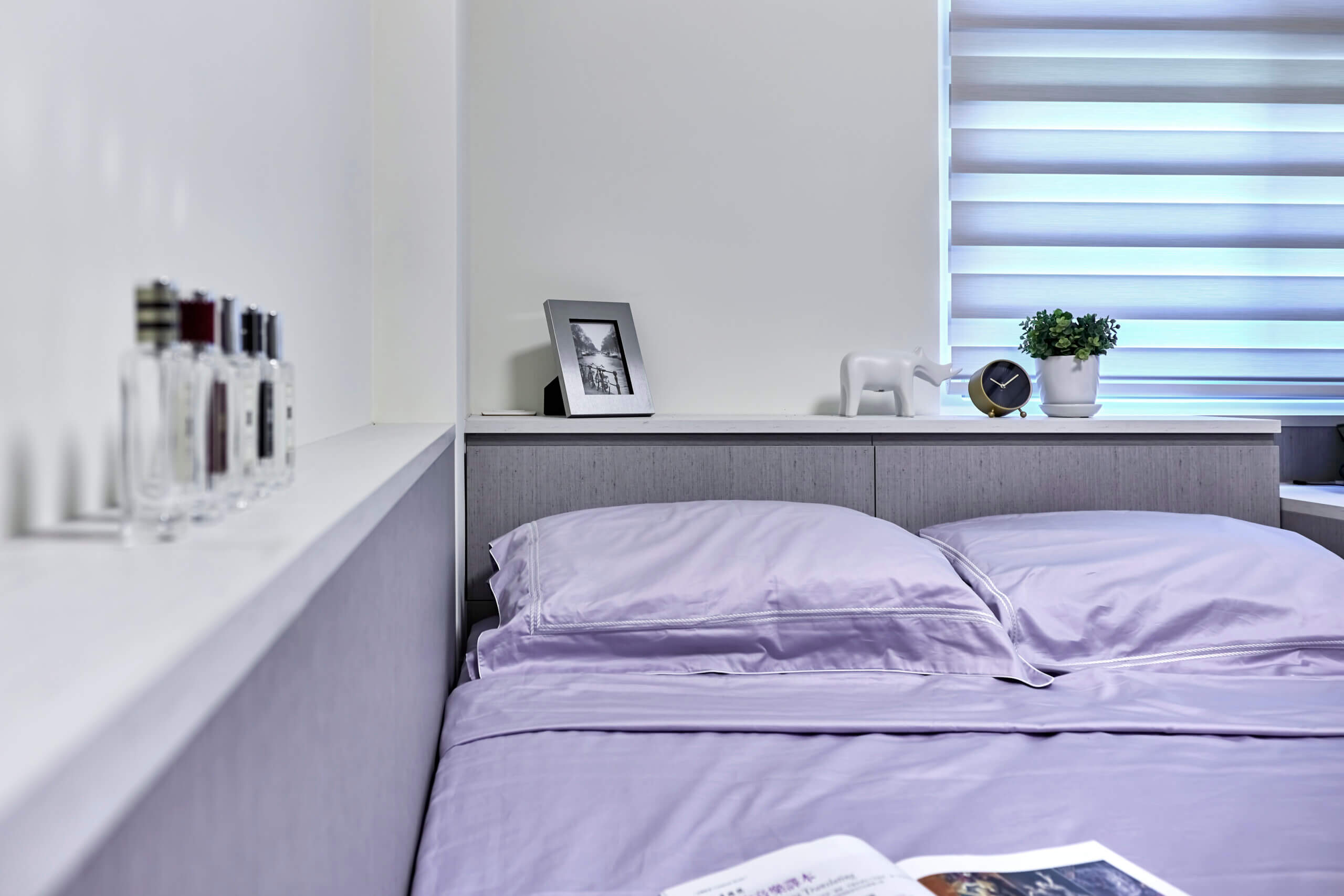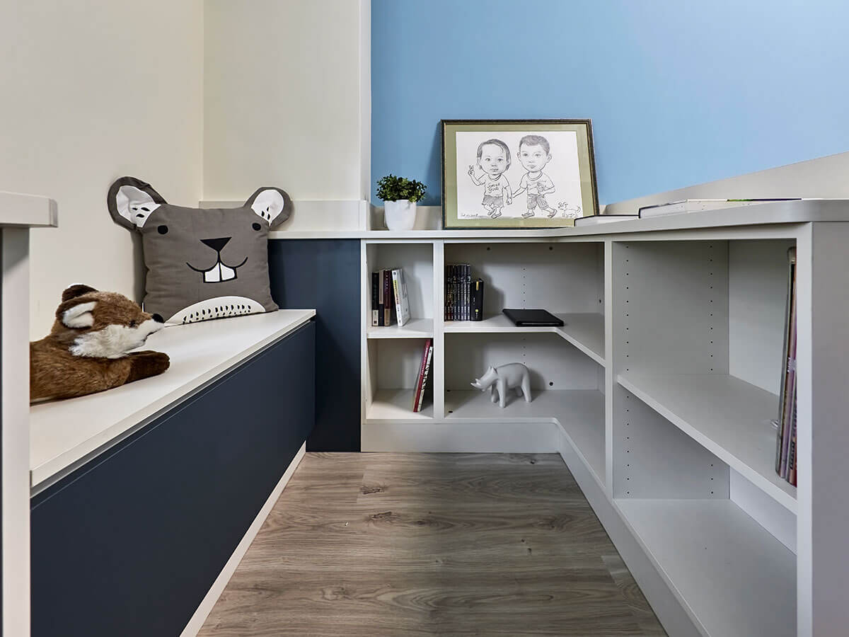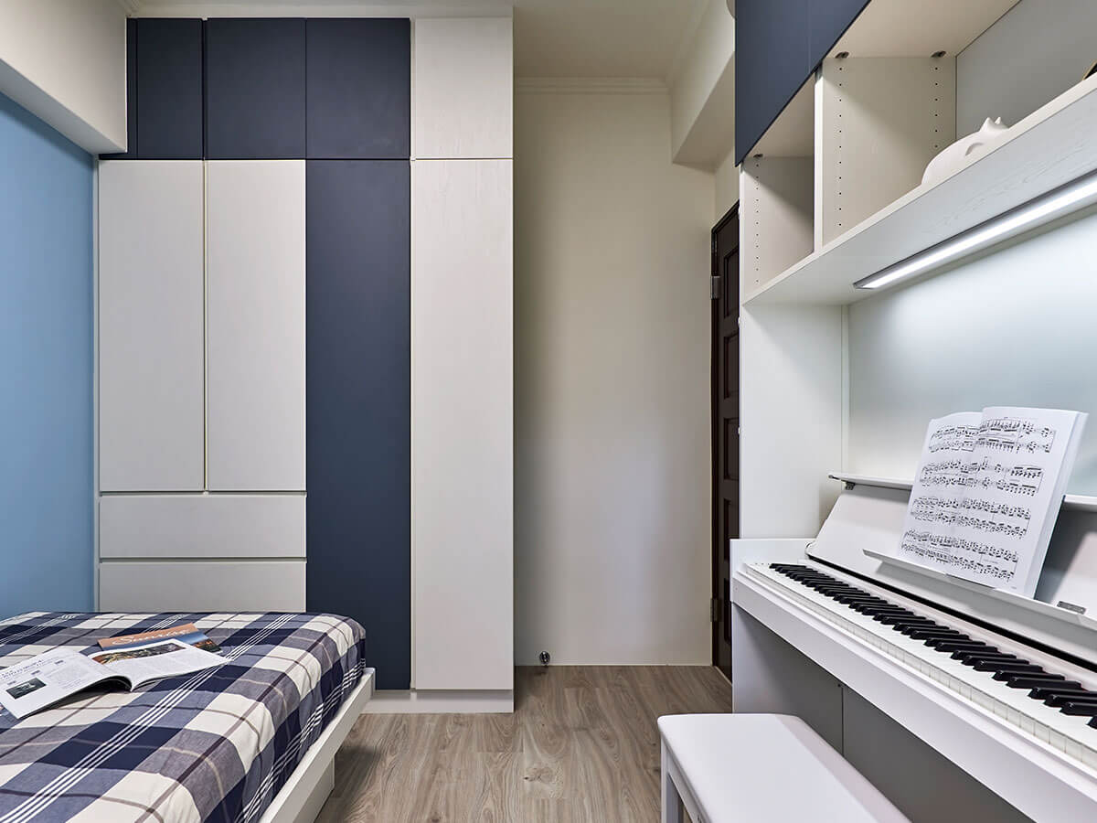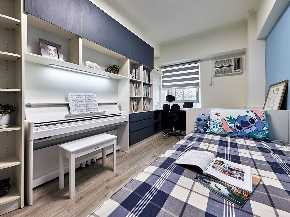 牆面柔和明朗的藍色是房間主要顏色,對面貼牆的書櫃則是深藍與白色的對話,色調很有層次,尤其中段的櫃面面板延做到窗下,可讀書、可置物,用途靈活,在這長形的房間內,再從藍牆一字形開展書桌區、睡榻區,功能全到齊。