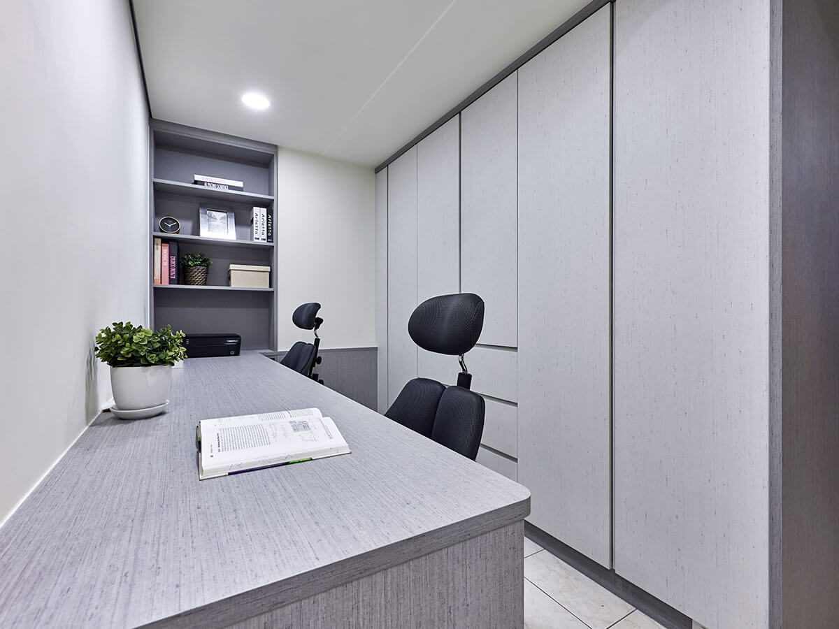 男主人把健身器材搬進主臥室,經常需要在家上網、看書的女主人,在餐廳對面、主臥室和兒子房之間跳出長條形的開放式書房空間,木紋長桌可以擺得下兩張電腦椅,容納兩個人靜心閱讀或居家工作,設計師還特地在椅子後方設立一組高達天花板的靠牆系統櫃,採取同樣的主題灰色調,可供放置書本及雜物,收納空間絕對夠用。