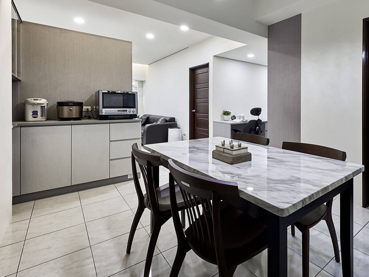 鞋櫃向後轉,白色側面做出區隔,轉向餐廳這面只做一半高度的櫃子,主要是為在平面上要放置熱水器等等電器用品,而且L形的櫃面延伸到靠牆位置,跟天花板橫樑下的多層餐具系統櫃融合為一體,上半部陳列杯子或下半部打開櫃門儲放物品,各得其所。空間大改造後,人造石餐桌煥發優美的大理石紋,全家人終於能坐好、坐滿,共享溫馨的晚餐時光。