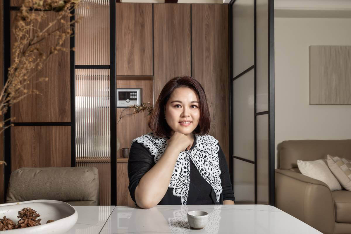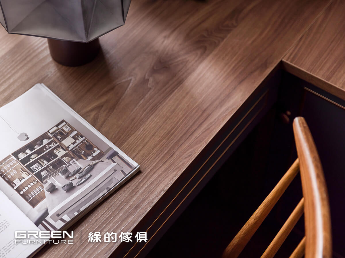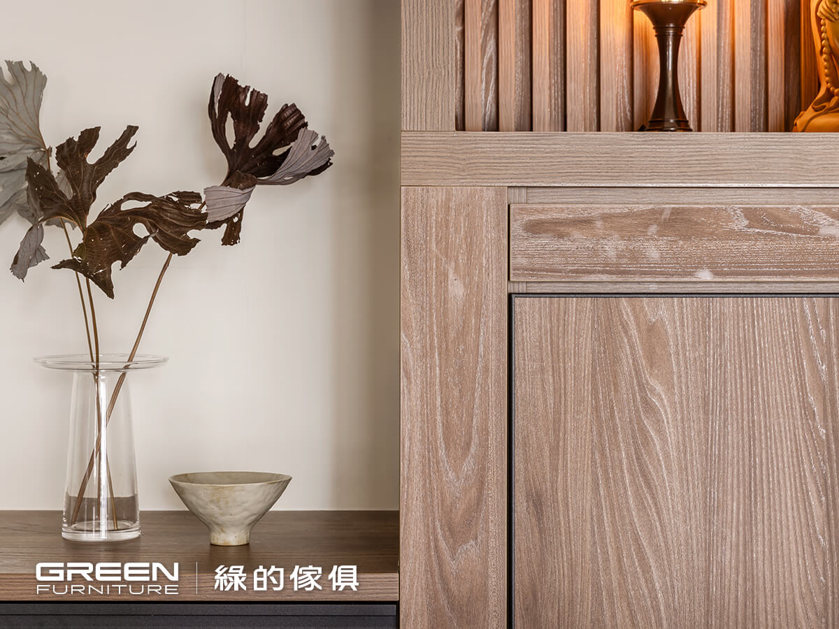 空間整體以溫潤自然為基底,運用「波爾櫻」系統板材細膩的木紋質感,搭配ALI黑色鋁框玻璃門片,展現俐落現代感。長虹玻璃則在佛堂設計與公共空間中悄然流轉,為空間增添微光層次,次臥則以香頌門橄欖綠金色框門片點綴,溫柔中帶著雅致質感,異材質間交織出細膩層次。