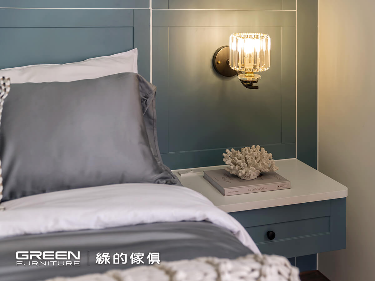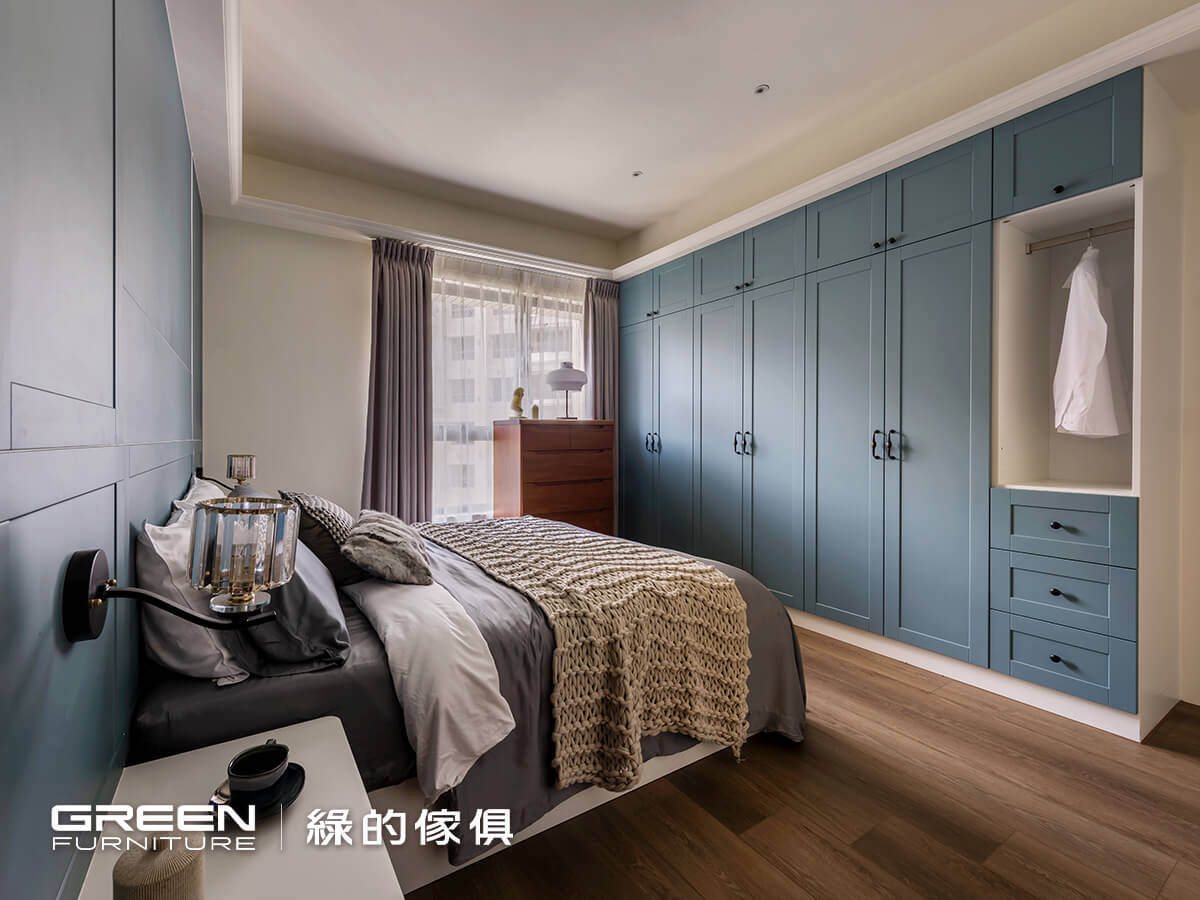 主臥室內設計從公共空間的現代溫潤風格,順勢轉換為更具溫度的現代鄉村風格室內設計,展現私領域的優雅沉靜。整體空間以白色與錦藍色為設計主軸,床頭牆大面積鋪陳「錦藍」陶烤系統門片,搭配細緻的水性矽利康收邊工法,使色塊交界自然柔和,提升整體視覺的舒適度與精緻感。