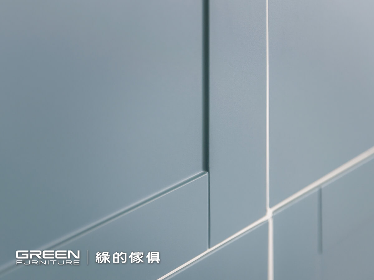 整體系統傢俱以木色、白色為主軸,局部以錦藍與香頌門-橄欖綠穿插提亮,讓空間層次更為豐富。佛堂設計以波爾櫻木紋、茶鏡交融,展現莊嚴卻不沉重的氛圍;主臥以藍白呼應靜謐感,次臥則以橄欖綠鋪陳柔和生命力。色彩之間細緻過渡,串起了家的溫度與故事。