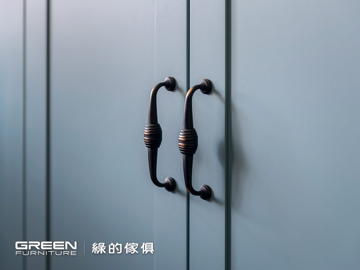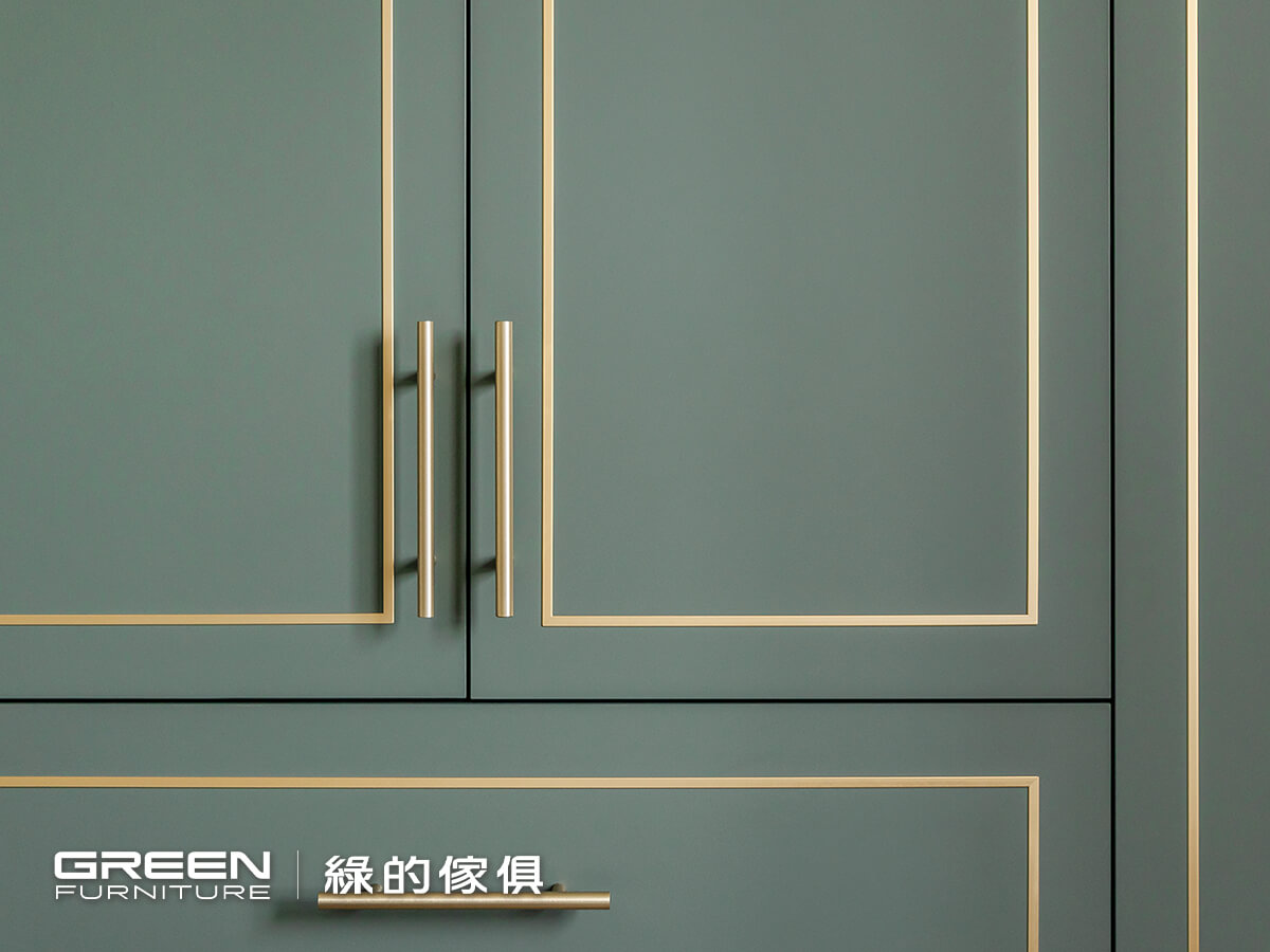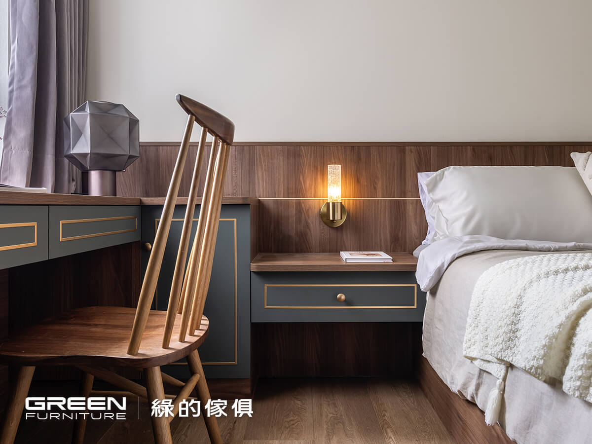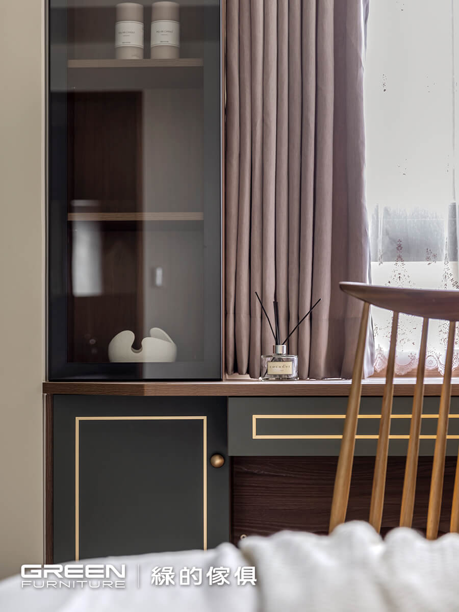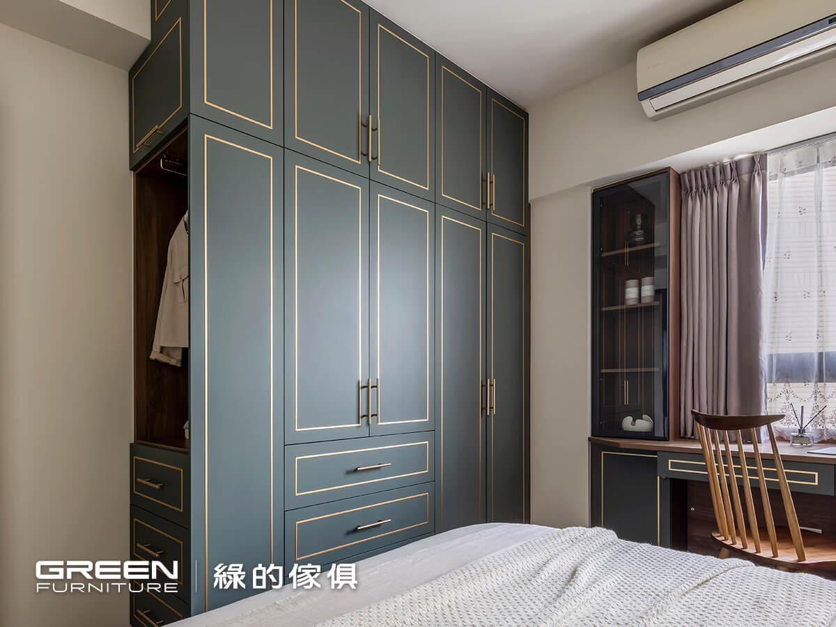 在這次的舊屋翻新專案中,次臥依據使用需求進行彈性規劃,展現高度機能與美感兼具的室內設計巧思。以「香頌門-橄欖綠」系統門片搭配「波爾櫻」櫃體板材,延續公共空間的溫潤氛圍,同時注入法式風格室內設計的優雅氣息,門片上以精緻的金色飾條做點綴,提升整體空間質感。