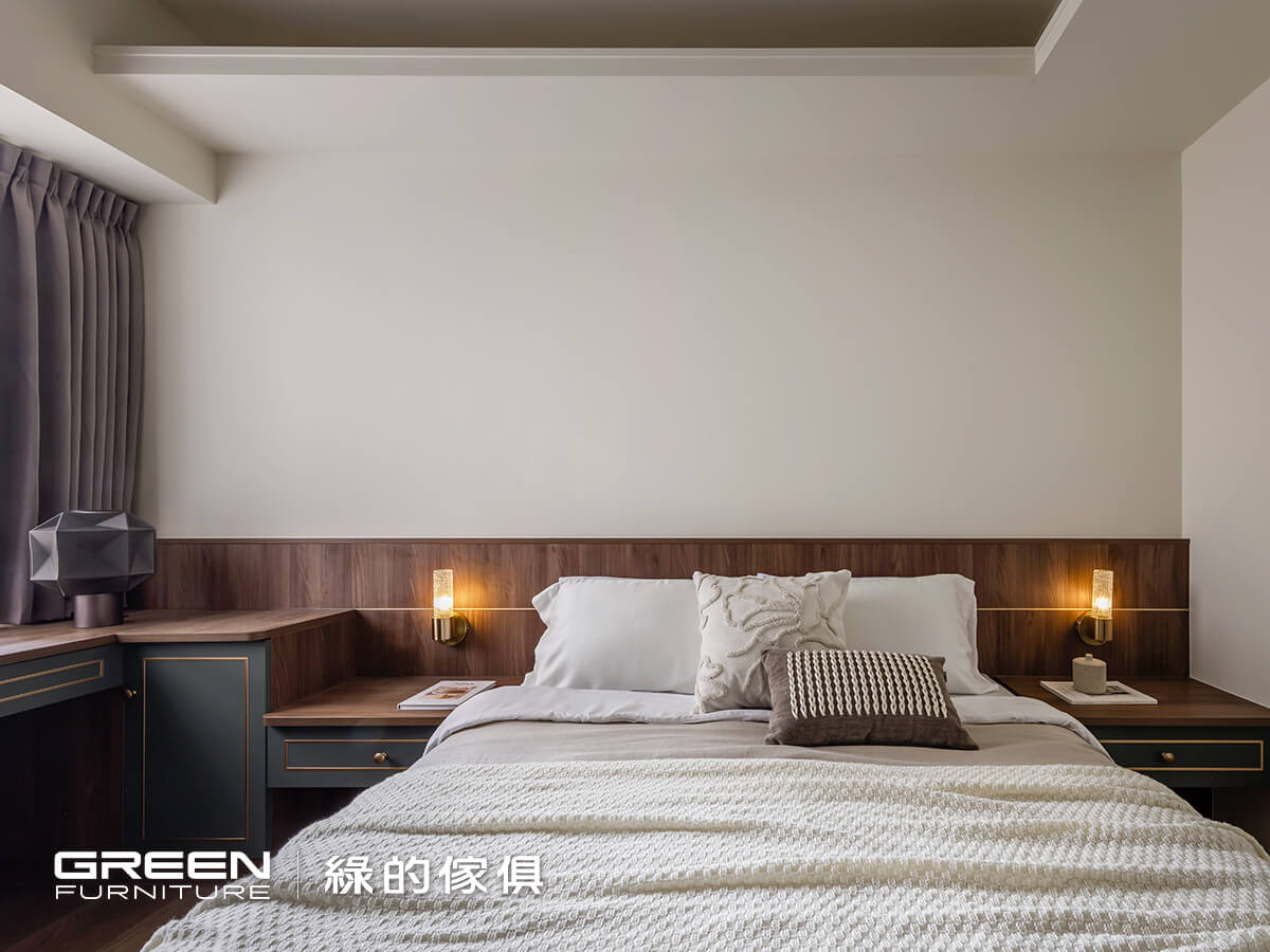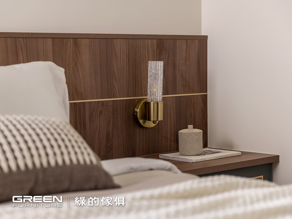 特製的床頭設計整合系統傢俱收納與展示機能,讓床頭不只是陳列裝飾品的場域,更具備實用的收納功能,符合現代生活對私領域機能化的高需求。在自然光線灑落之際,空間氛圍愈發柔和,每一次歸臥皆如進行一場療癒儀式,深刻體現室內設計結合生活感的細膩層次。