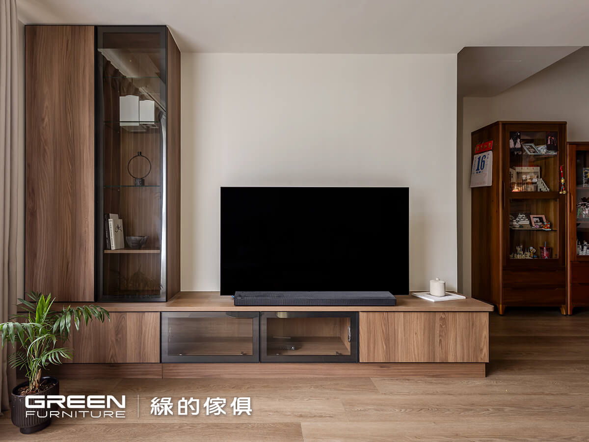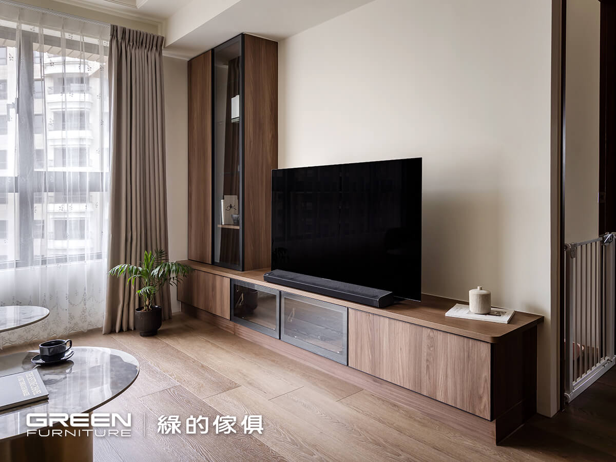 客廳主牆延續了玄關的語彙,以「波爾櫻」系統板材搭配長虹玻璃,構築出簡潔富有層次的視覺焦點。電視櫃結合黑色鋁框展示玻璃櫃,收納著屋主珍藏的星巴克鐵盒,每一件收藏在光影中悄然述說著家的故事。