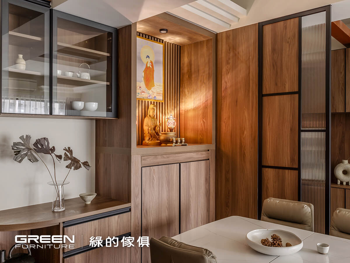 從中古屋佛堂設計的重新調整,到動線、櫃體、收納與材質細節的整合,本案展現出舊屋翻新中對心靈與日常並重的空間詮釋,也讓信仰成為生活中最溫暖的風景。