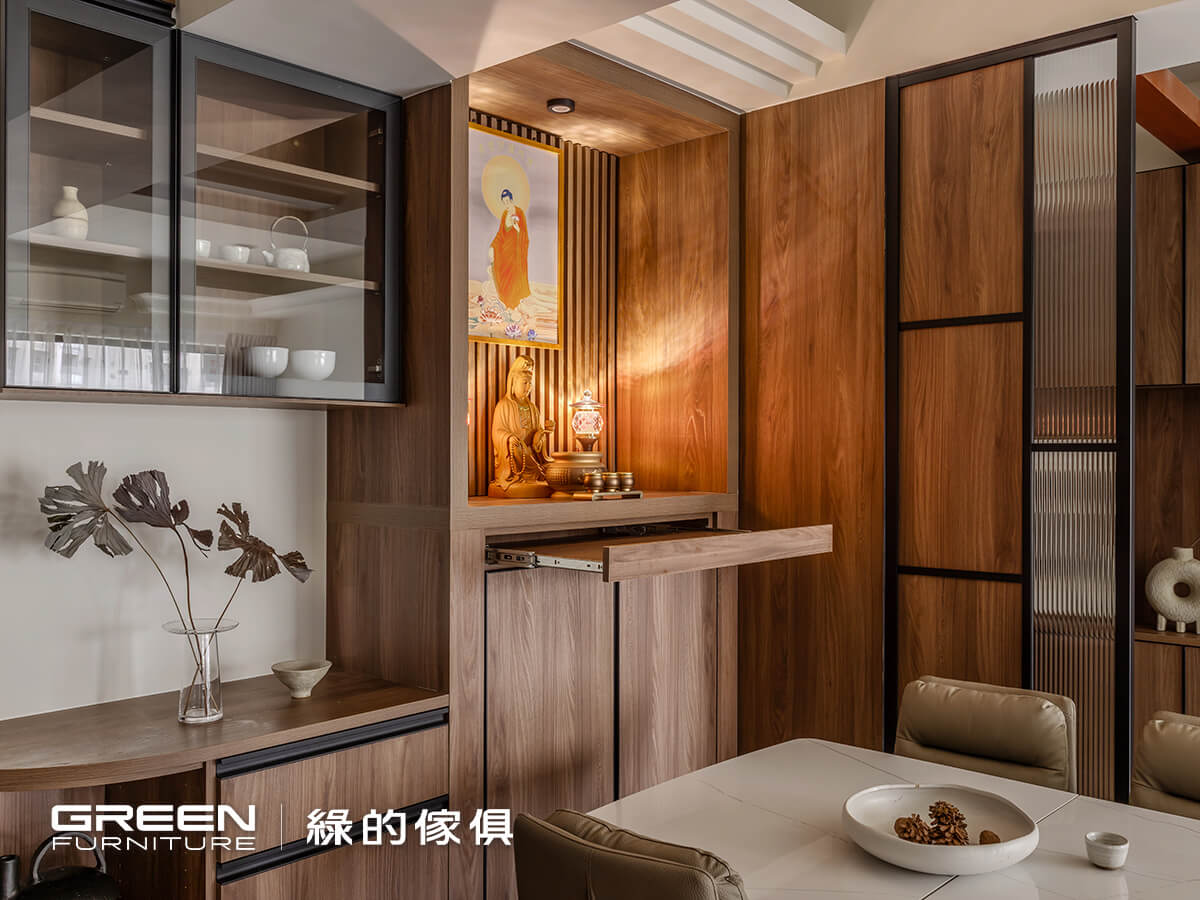 原本中古屋內的佛堂櫃體過於外凸且高度偏高,不僅造成使用上的不便,也對整體空間動線產生阻礙。設計師重新調整比例,落實人體工學佛堂設計,並將櫃體適度內縮,有效消除動線干擾,避免日常磕碰。