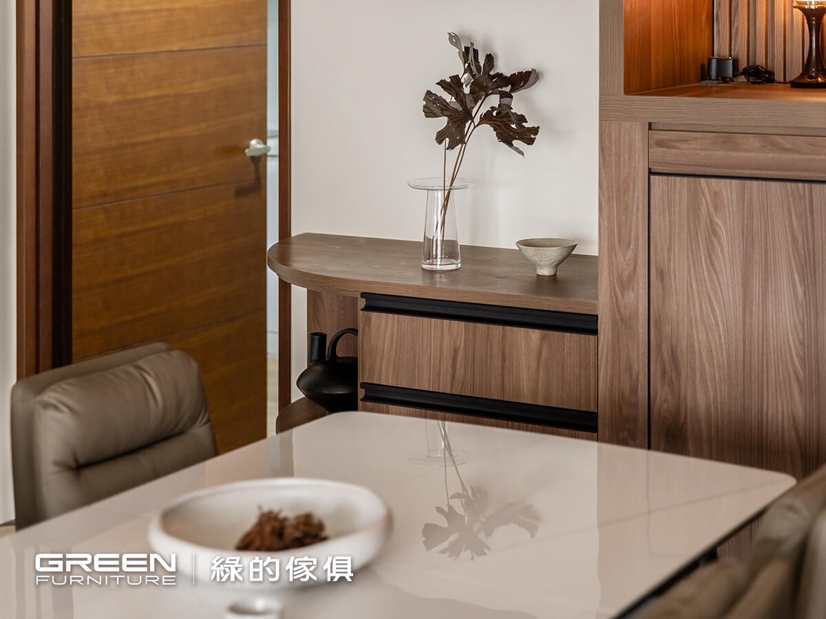 餐廳與廚房的整合設計成為提升日常機能的核心。沿著佛堂空間的結構順勢延伸,以弧形轉角設計柔化餐廚動線,減緩轉折處的壓迫與緊繃感,展現細膩的室內設計巧思。
