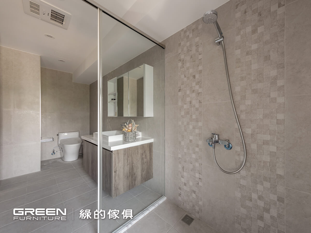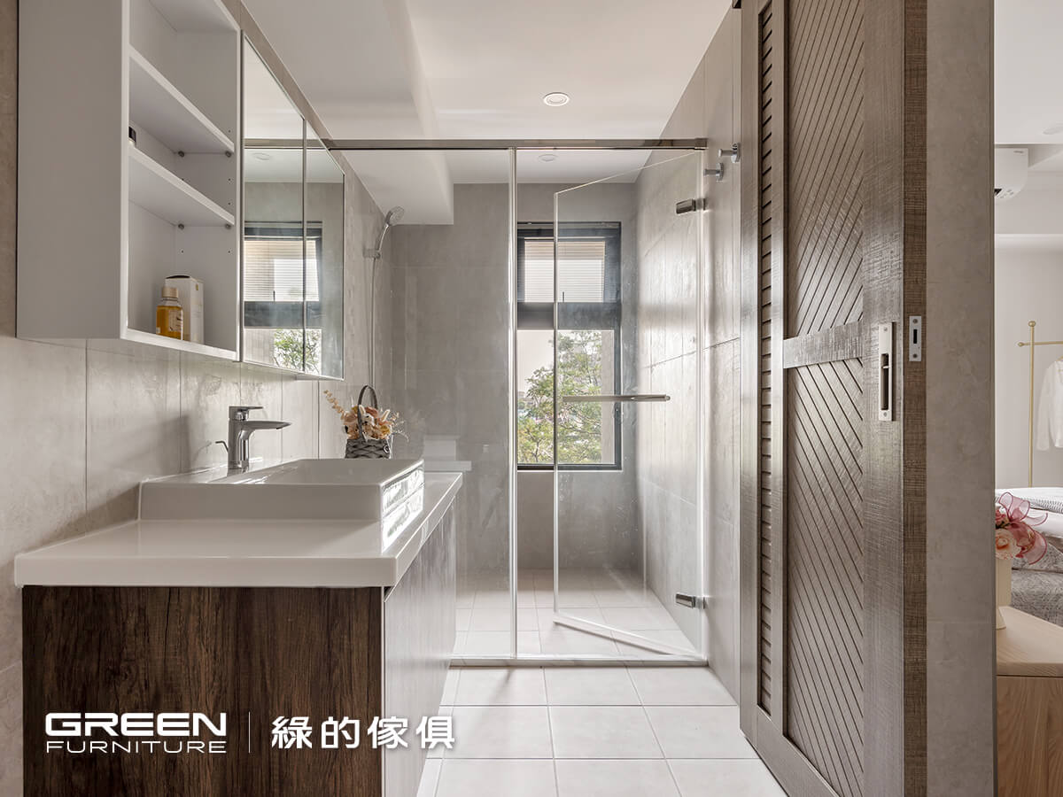 以淡雅的灰米色磁磚鋪陳整體空間,局部以細緻方格紋理做出層次變化,兼具簡約與質感。洗手台採懸空設計,搭配木紋櫃體與白色檯面,線條俐落、方便清潔;鏡櫃結合開放層架,滿足日常收納與展示需求。乾濕分離區以玻璃拉門界定,維持明亮採光與清爽視覺。整體色調柔和、材質細膩,讓衛浴空間在簡潔中多了份溫度與放鬆感。