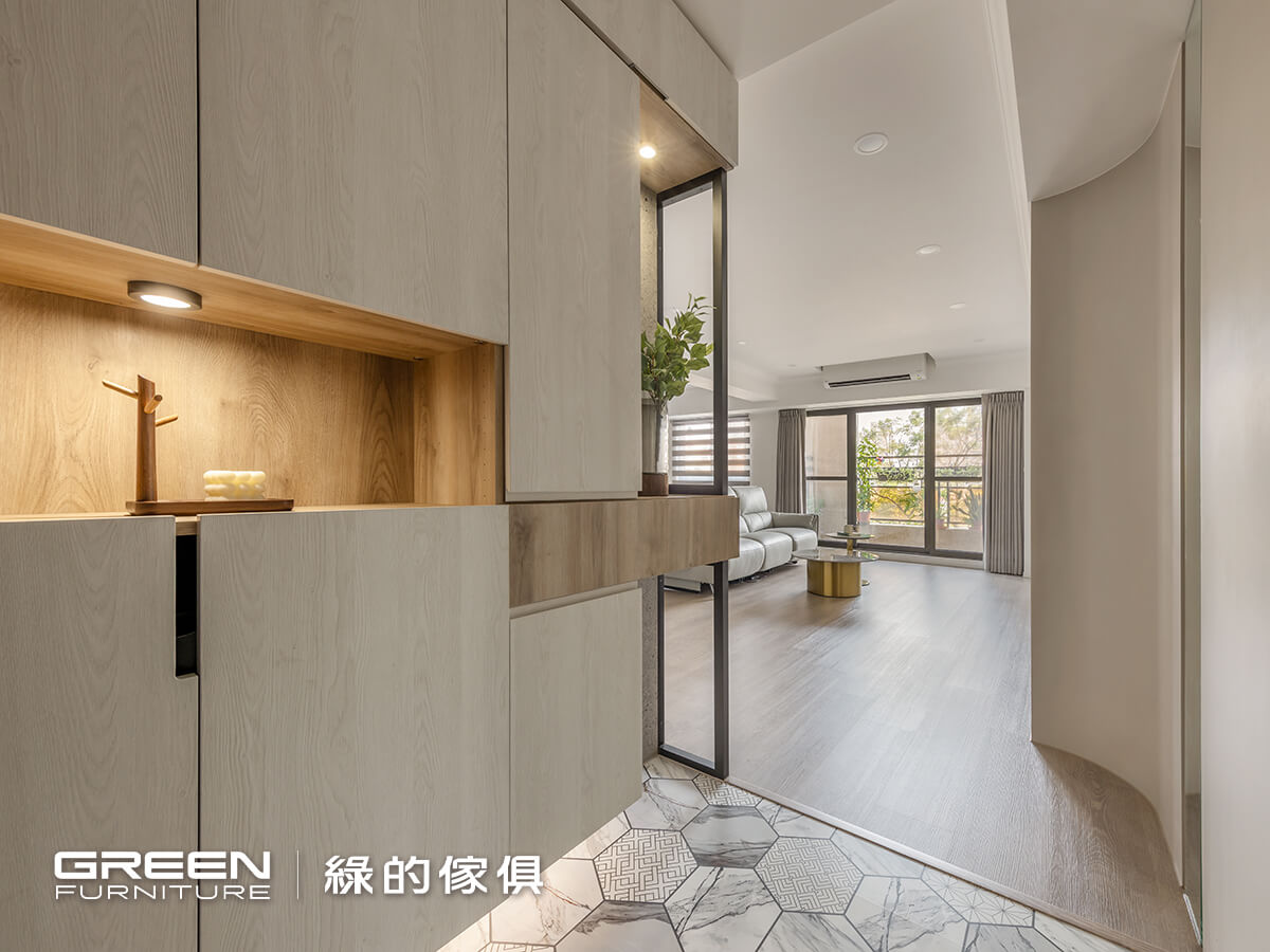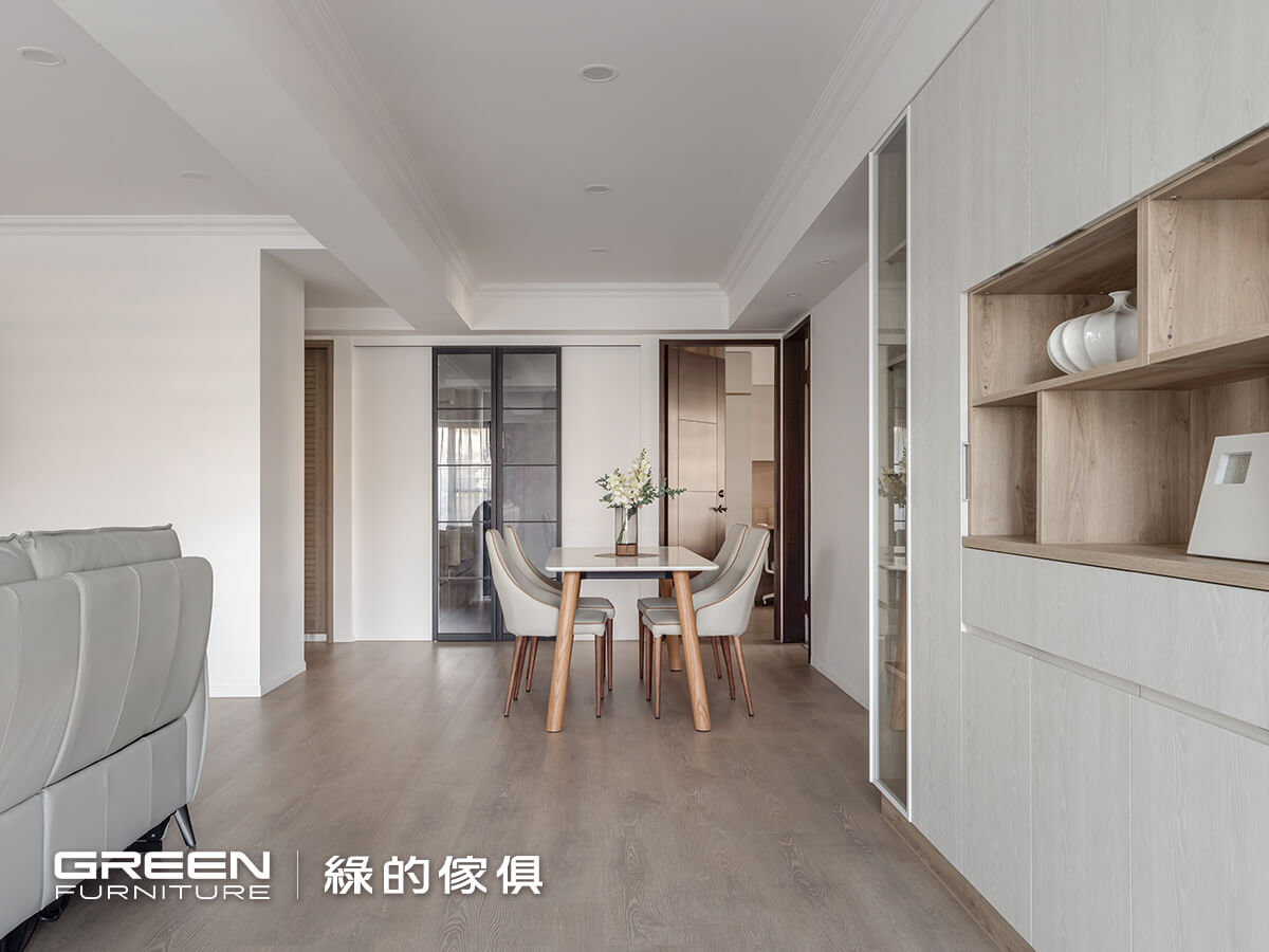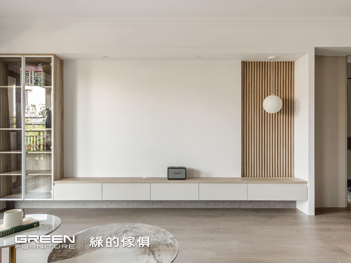 「你們會怎麼用這個空間?會放什麼?日常的節奏是怎樣?」設計師說,在每次公領域的系統傢俱規劃前,我們一定會先把生活方式讀懂,才能拿捏好收與放的比例。這次依照夫妻倆的需求,替展示、儲物、日常使用與掃地機預留位置,每一個櫃體的深度、開放與封閉比重,都在設計初期就被仔細計算,做到好看又實用,也延續綠的傢俱在室內設計與室內裝修中的一貫堅持:所有櫃子都不只是收納,而是生活中的風景。