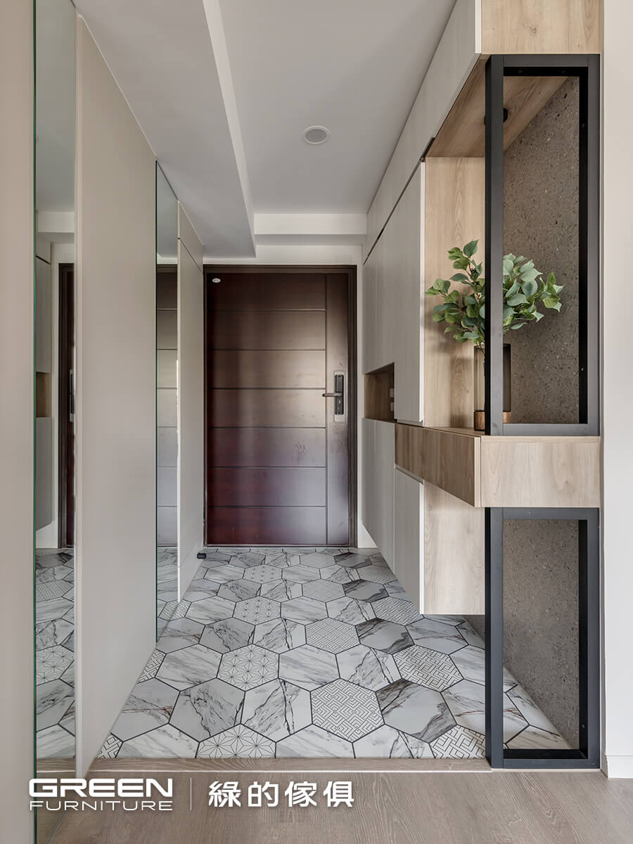 本案在建材選擇上,以安全、耐用與好維護為首要原則。全室系統櫃皆採用綠的傢俱 F1 等級低甲醛板材,廚房牆面以 AICA 防火防潮壁板+琺瑯板 覆蓋舊磁磚,省去拆除粉塵與工期問題,兼具耐熱、防油污與易清潔的實用特性。玄關與公領域地坪採用 SPC 石塑地板,呈現六角花磚的視覺效果,不需敲除原地磚即可完成施工,具備抗潑水、耐磨與好維護的優點。