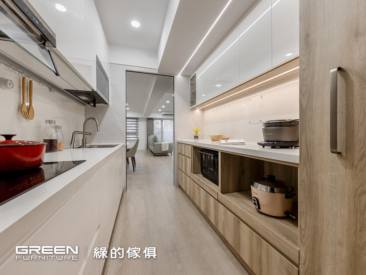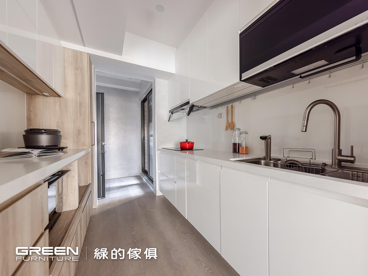 根據格局採以二字型廚具配置,依序於壁面覆蓋 AICA 防火防潮壁板與琺瑯板,既可避免拆除舊磁磚帶來的冗長工期與粉塵,也能達到耐熱、防油污、好清潔的特性,同步配置大怪獸直立式拉籃,使各種零散物品隱於無形,也易於拿取收放。重要的是,廚具擁有 TKCAS 品保認證作為安心後盾,並搭配專利不鏽鋼水槽止水前緣與專利 S 型防異味防蟑排水管,在使用與維護上更放心。