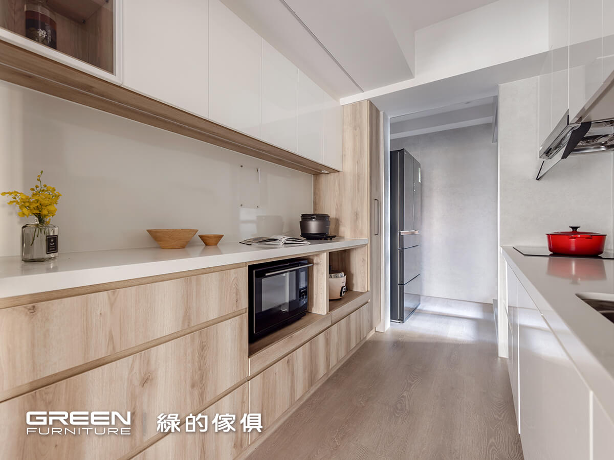 「當時蔡太太也向我們坦白說,廚房有想配合的品牌,但基於設計整體性的原則下,我們仍會提供完善的配置建議,但沒想到她看完後,決定交由我們一併施作。」設計師接著分享,所謂廚房設計,不只單單做廚具,而是要把客人所有的需求都納入安排,因此從下廚習慣、收納機能,再到冰箱與微波爐等家電設備的尺寸型號,逐步釐清確認後才著手規劃。