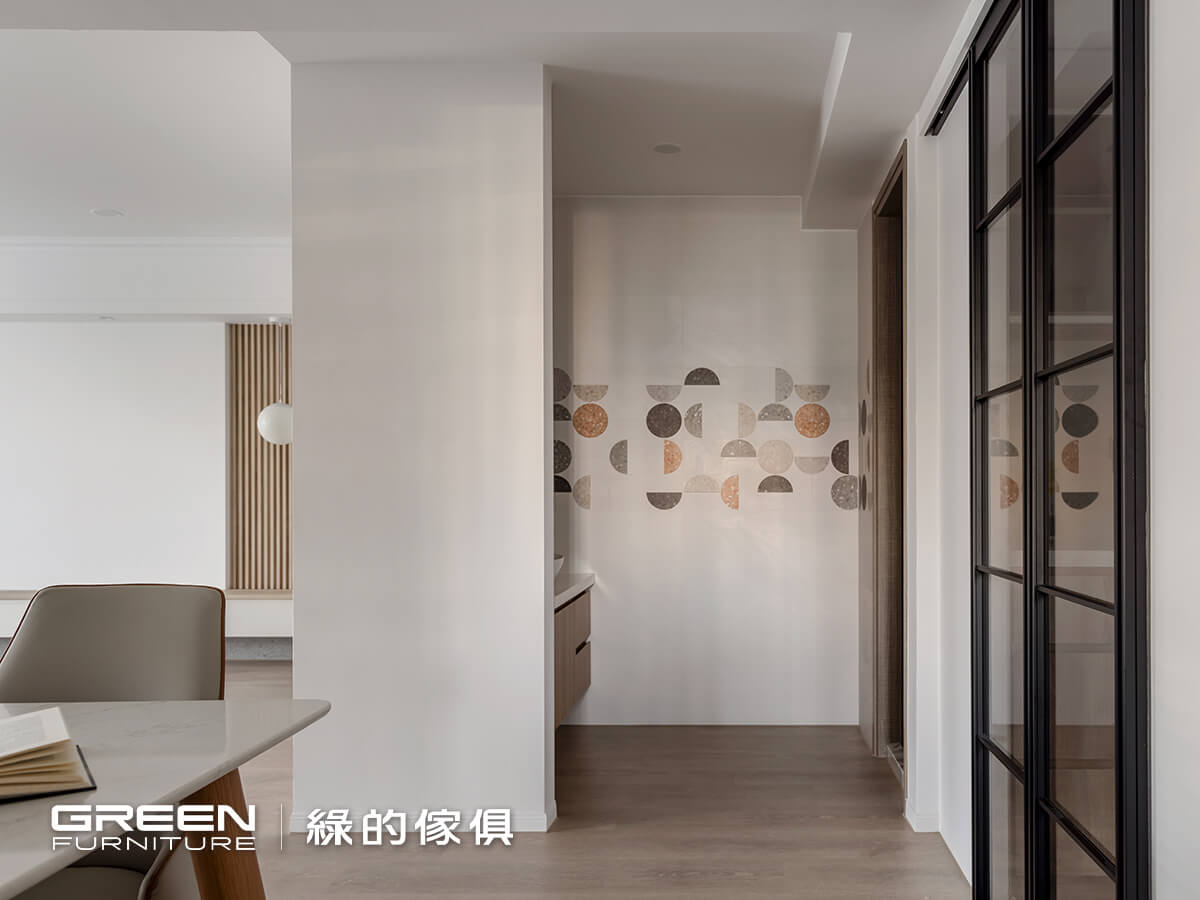 為了讓生活動線更順暢,設計師將洗手台外移至餐廳旁的半開放區域,不僅方便日常使用,也避免家人同時盥洗時的擁擠。以幾何拼貼磁磚作為立面主視覺,融入圓弧與半圓造型的節奏;懸空木紋檯面搭配圓鏡與簡約盆型,讓機能與美感並行,成為公領域中自然過渡、卻又令人駐足的細節亮點。