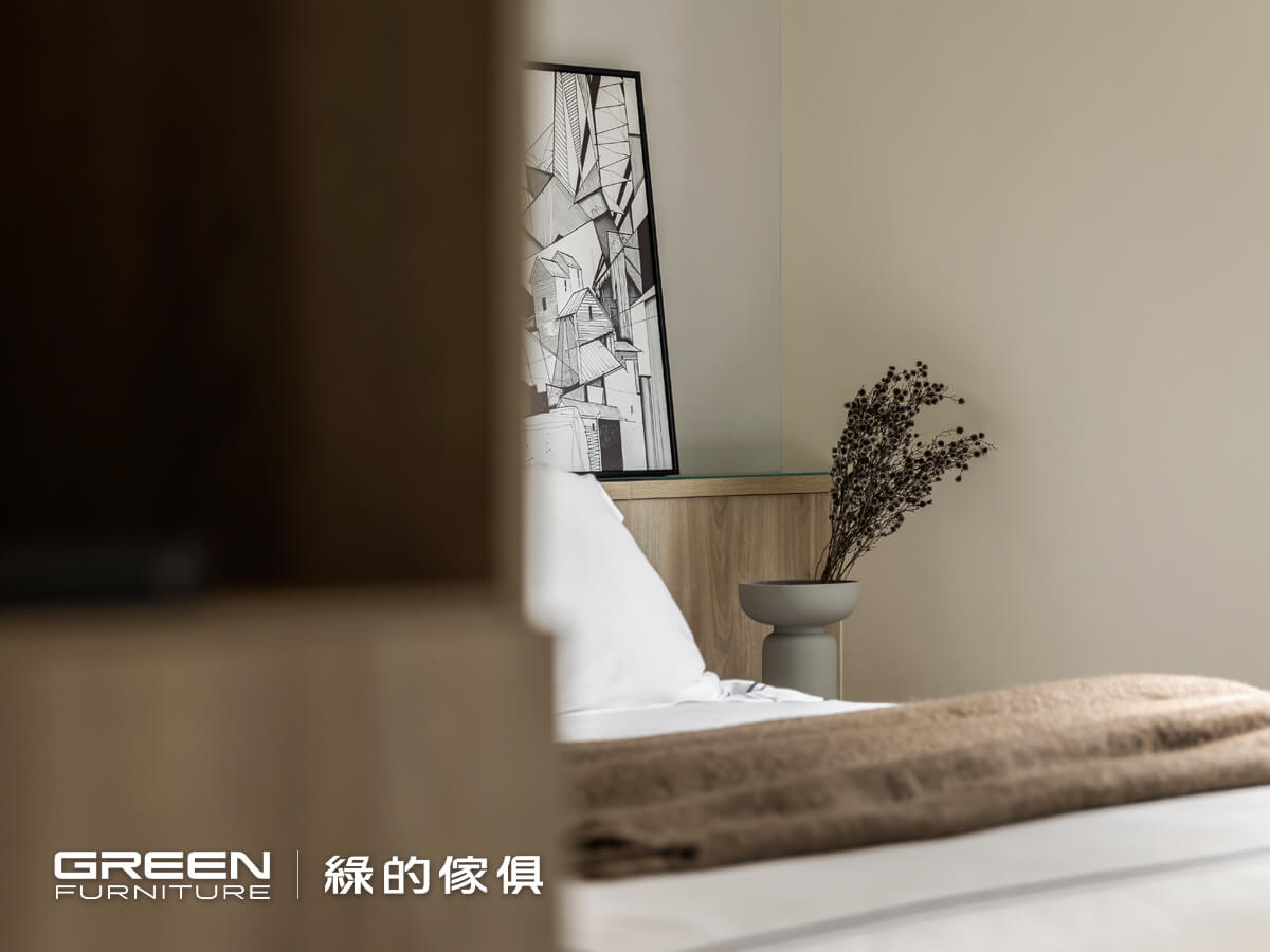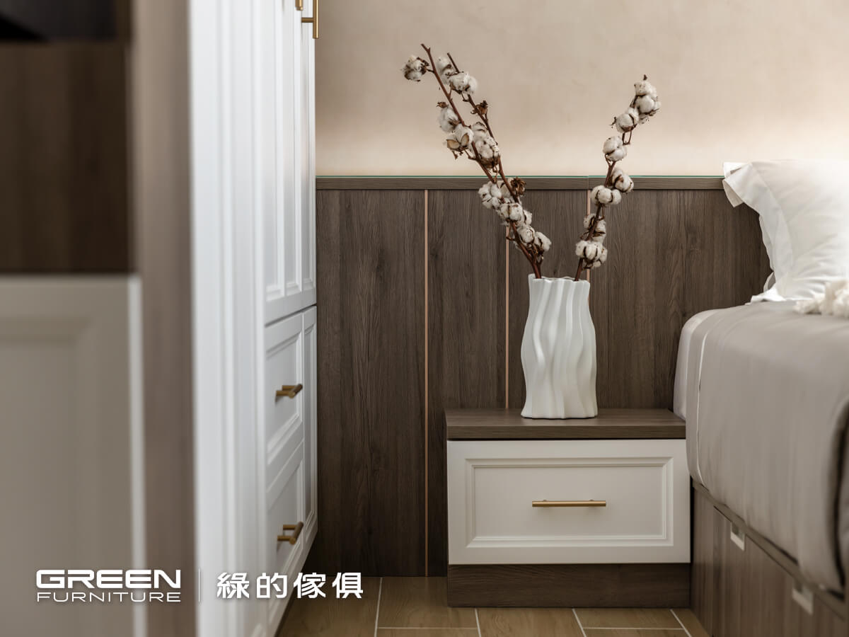 床兩側設置無把手抽屜式床頭櫃,結合抽屜床設計,巧妙補足床頭空間使用機能;壁板則選用與櫃體相同色系系統板材,提升整體一致性。衣櫃設計融入金屬感、復等元素,搭配無把手門片設計,展現極簡而細膩的收納美學。特別設計的鈦絲褐邊櫃,結合展示與修飾功能,是長型透天裝潢中不可或缺的細節巧思。