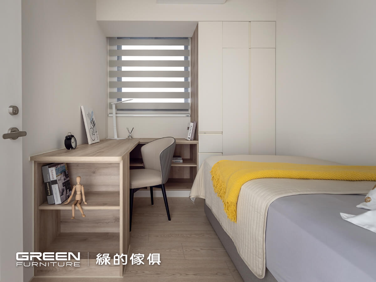 注重公平性的屋主,對三個女兒房間的規劃如出一轍。以奶橡與鑼帛搭配打造大型衣櫃及鏤空書櫃,奶橡也負責面對窗戶的書桌,讓它順利迎接大片窗光,再以史藍丁把手打造安全不雜亂的臥室空間。原木質感的質材盈滿於室,彷彿把大自然迎進房間,更加拉大採光與視線範圍。不同的儲藏需求也因人而變,除了單純的層板與吊衣桿,更增加抽屜、開放式收納、玻璃吊櫃等,讓收納或展示產生更好的效果。