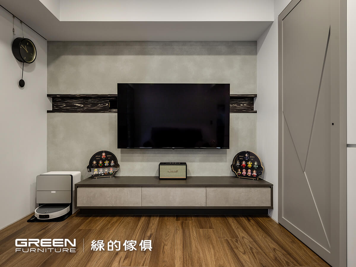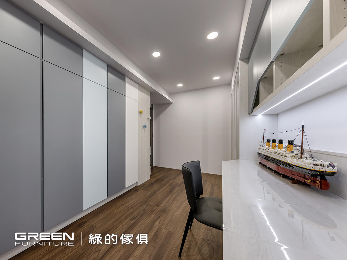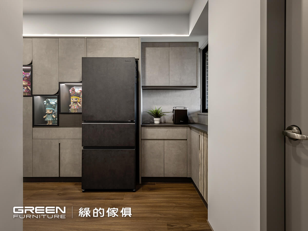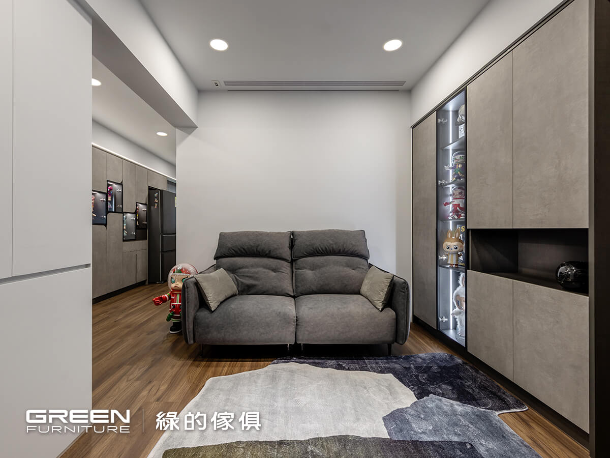 由 綠的傢俱設計團隊 規劃後,整體以灰色系為基調,透過燈光、系統櫃材質與造型線條的運用,讓一家四口的生活更加有序、舒適,也展現現代家庭對居住美感與機能的雙重追求。
