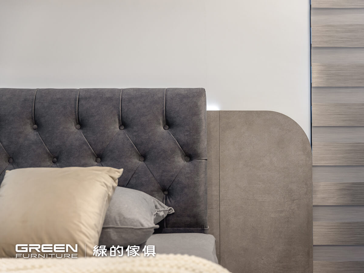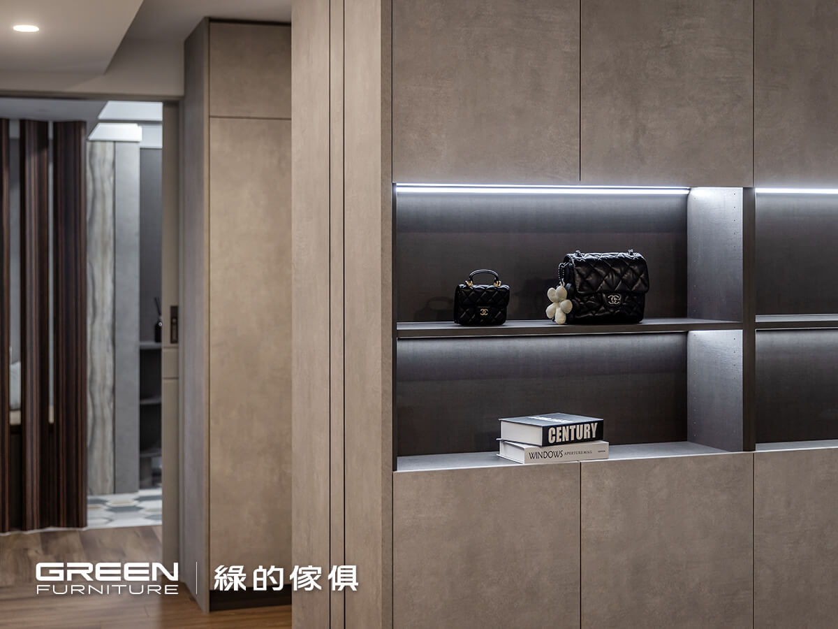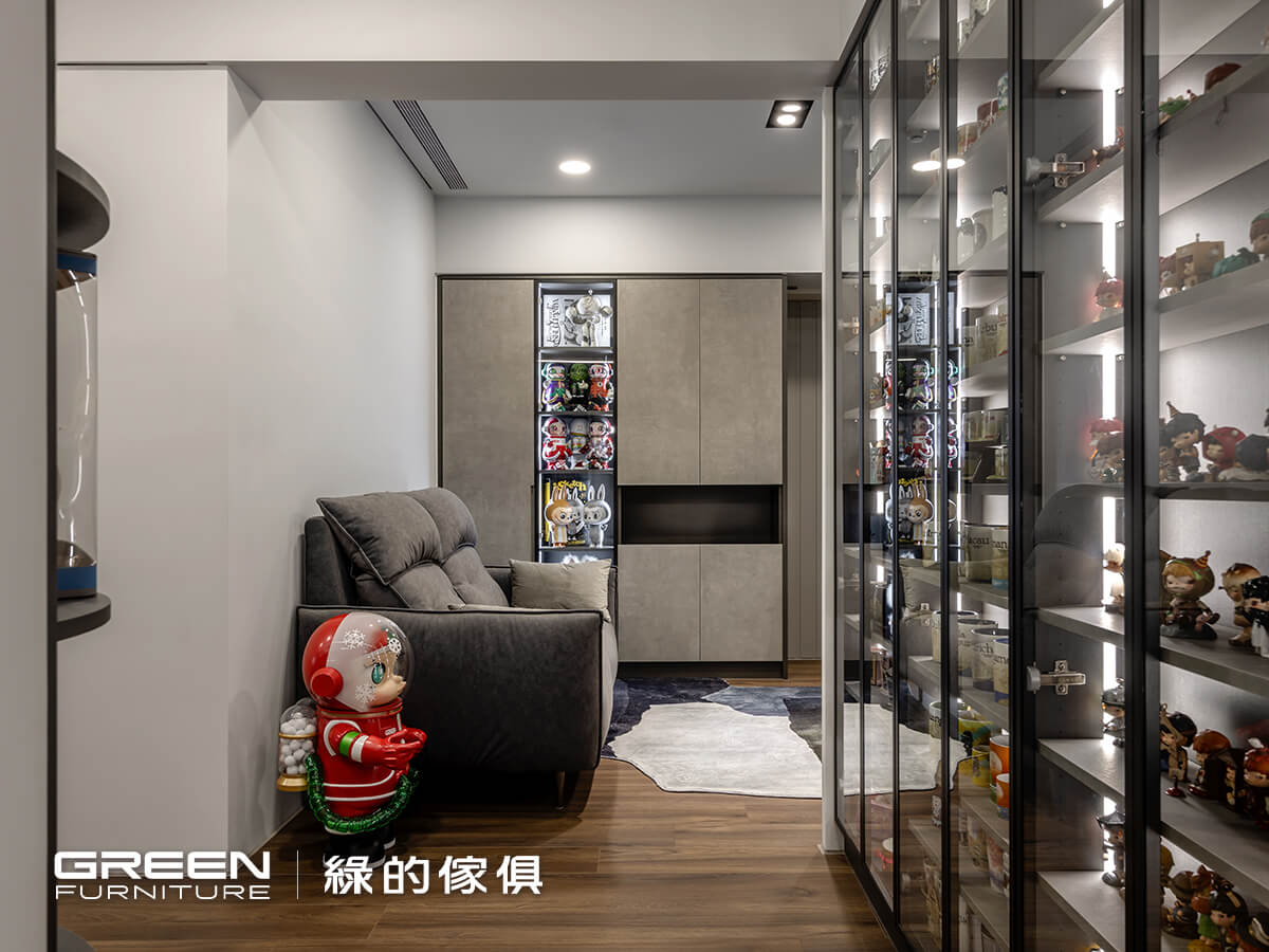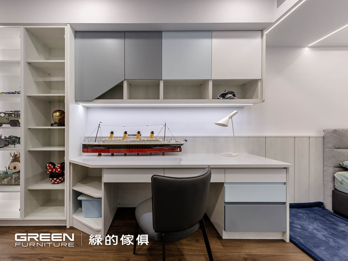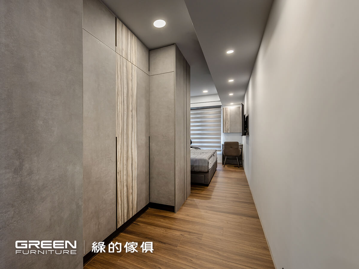 由 綠的傢俱設計團隊 規劃後,整體以灰色系為基調,透過燈光、系統櫃材質與造型線條的運用,讓一家四口的生活更加有序、舒適,也展現現代家庭對居住美感與機能的雙重追求。