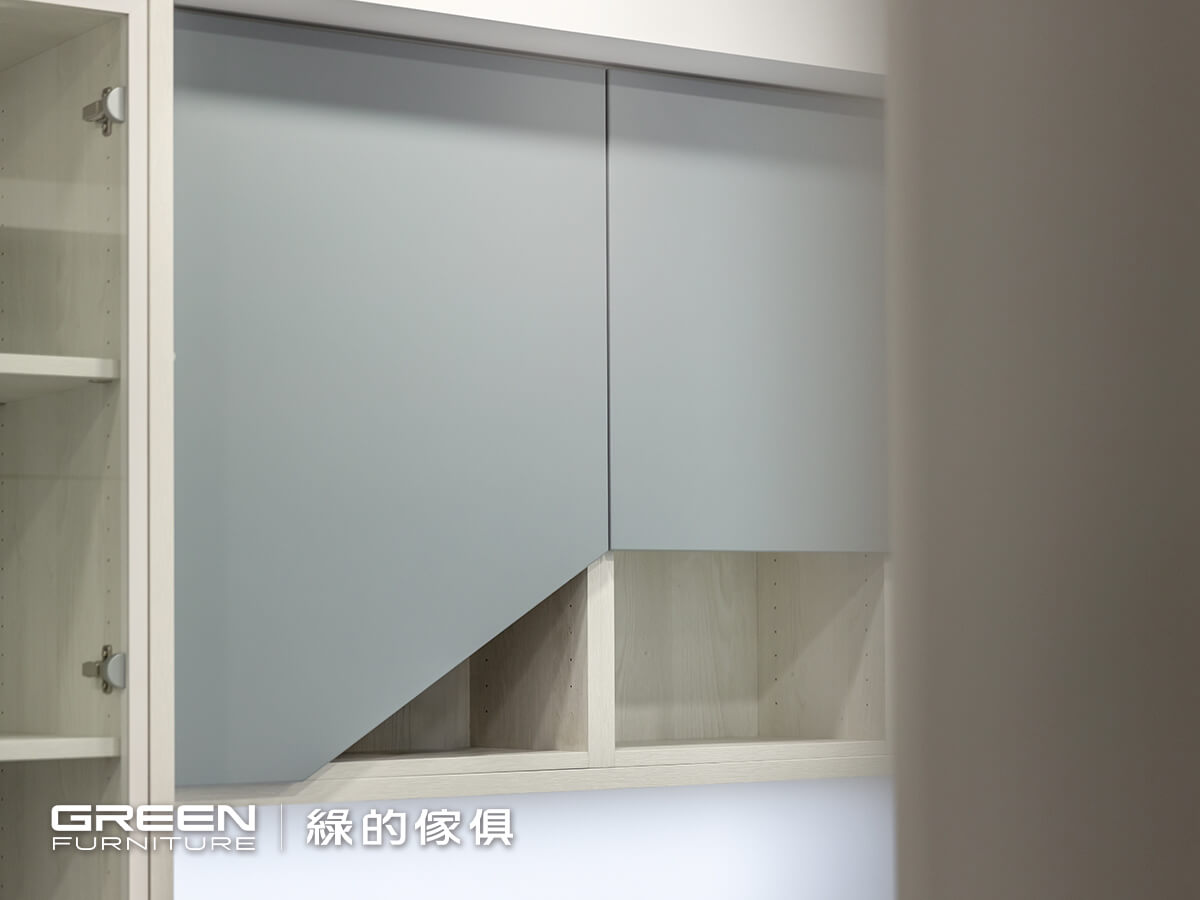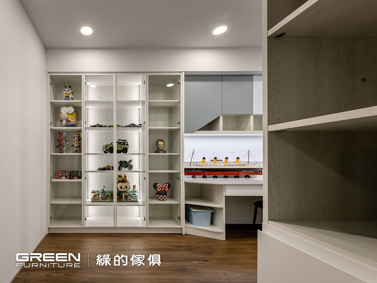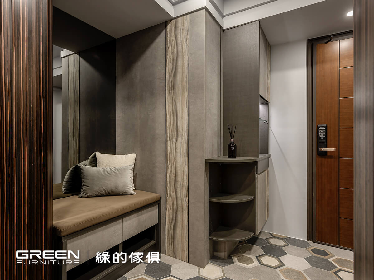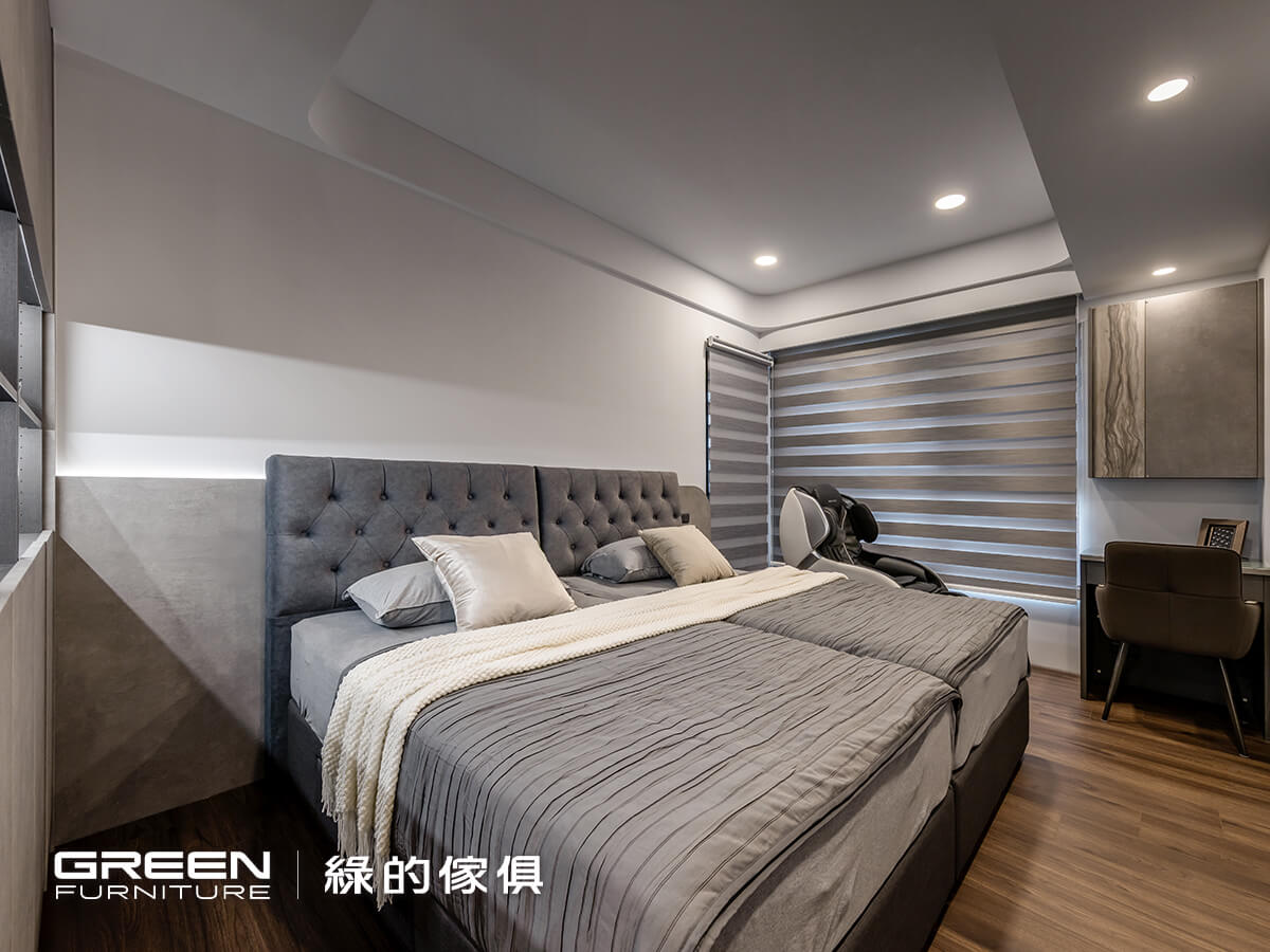 由 綠的傢俱設計團隊 規劃後,整體以灰色系為基調,透過燈光、系統櫃材質與造型線條的運用,讓一家四口的生活更加有序、舒適,也展現現代家庭對居住美感與機能的雙重追求。