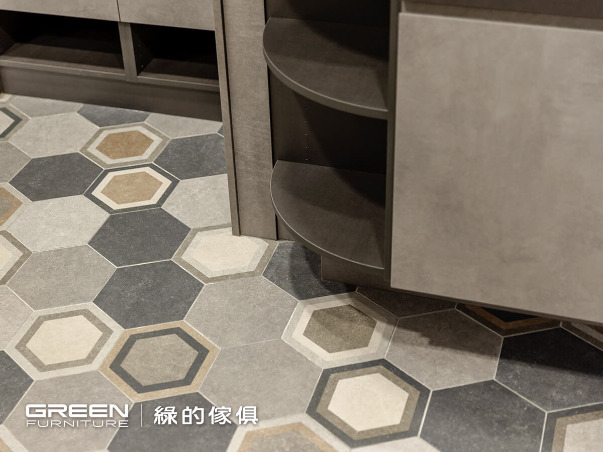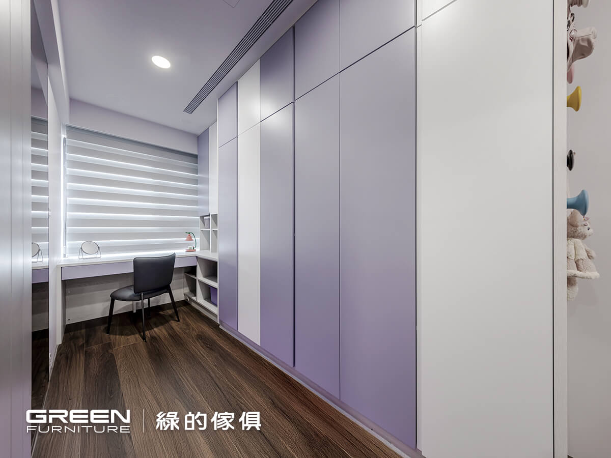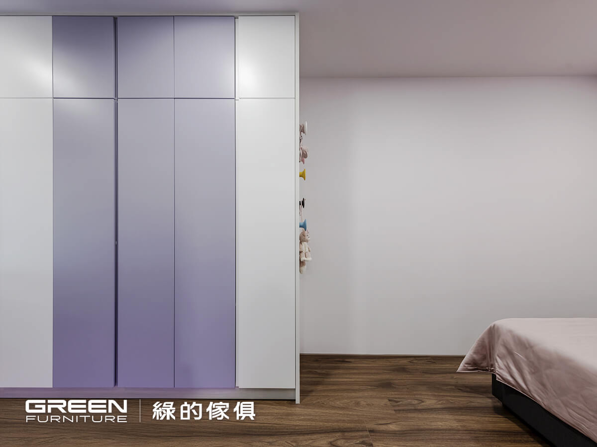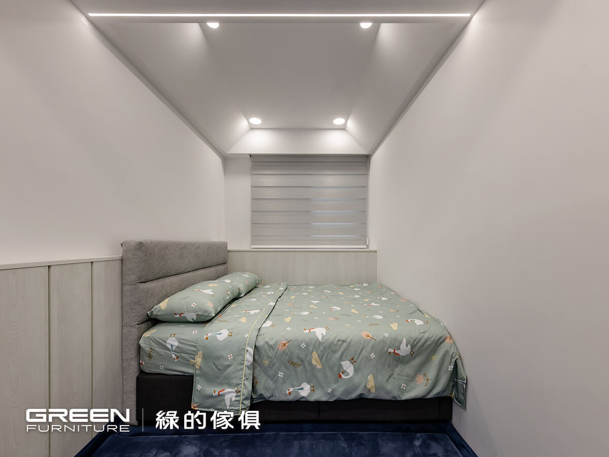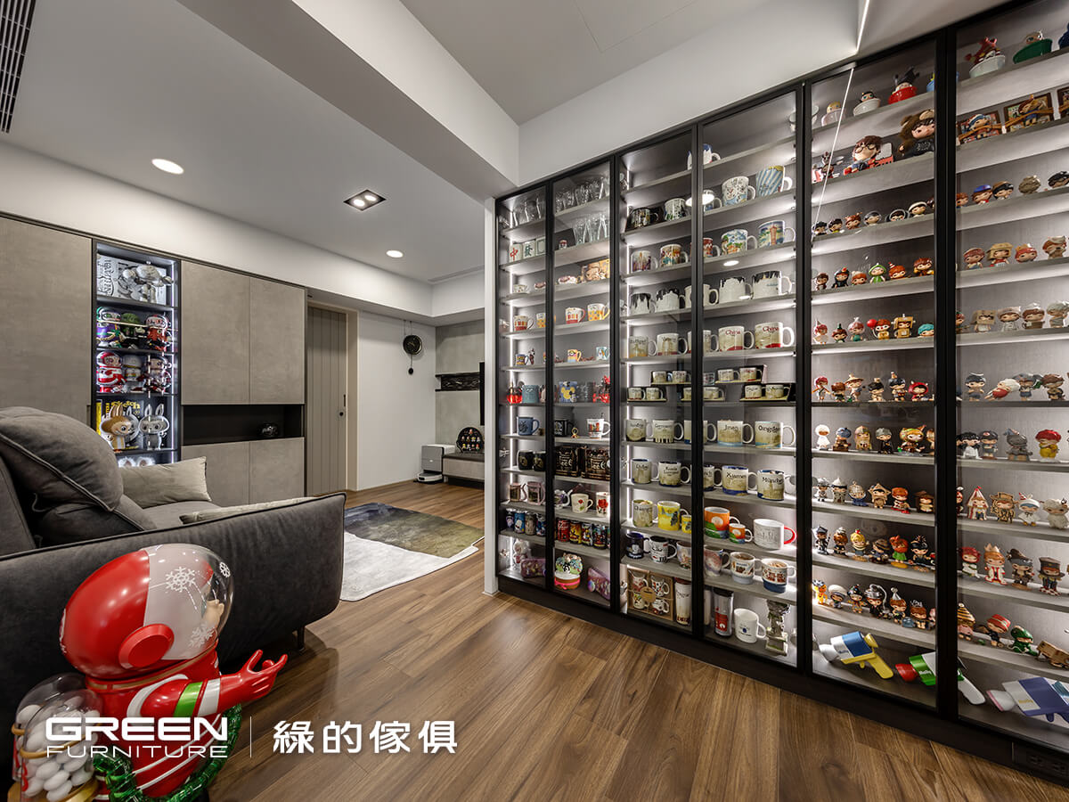 由 綠的傢俱設計團隊 規劃後,整體以灰色系為基調,透過燈光、系統櫃材質與造型線條的運用,讓一家四口的生活更加有序、舒適,也展現現代家庭對居住美感與機能的雙重追求。