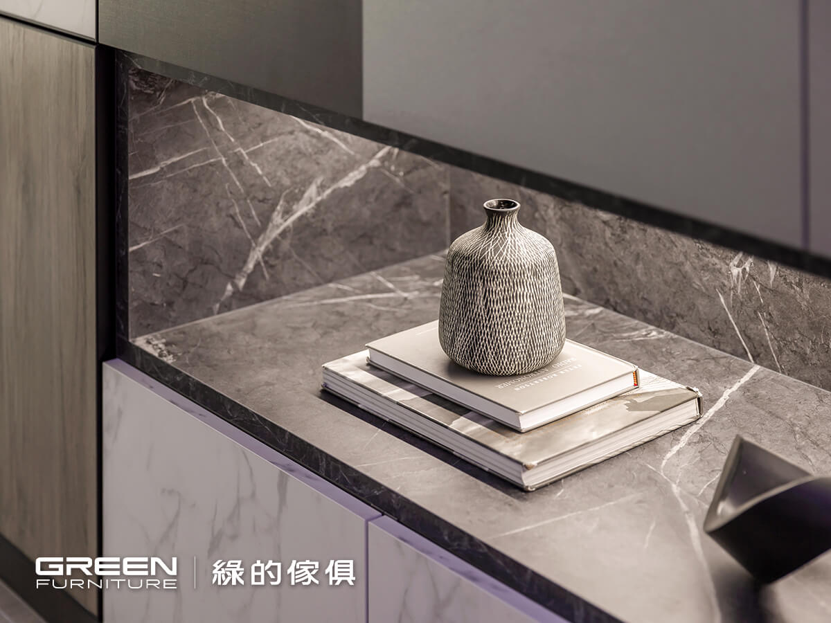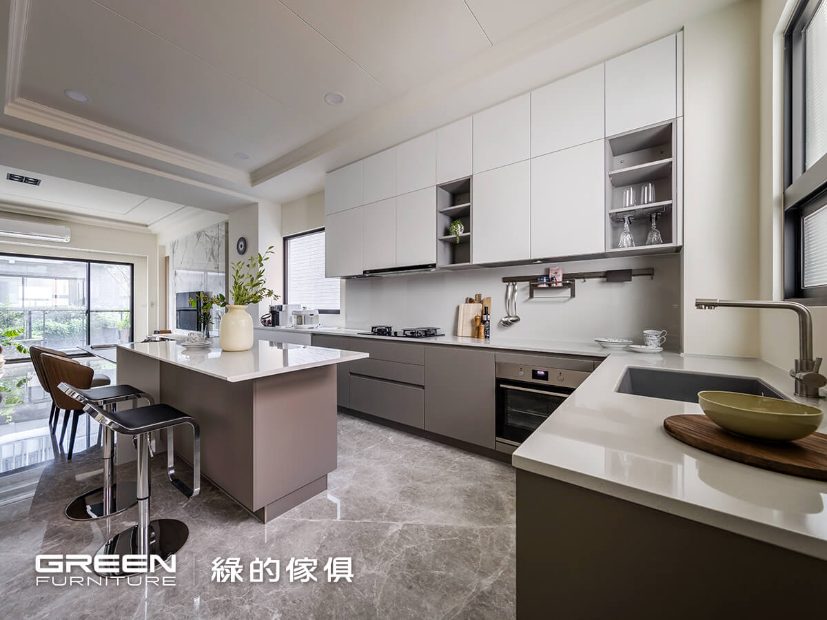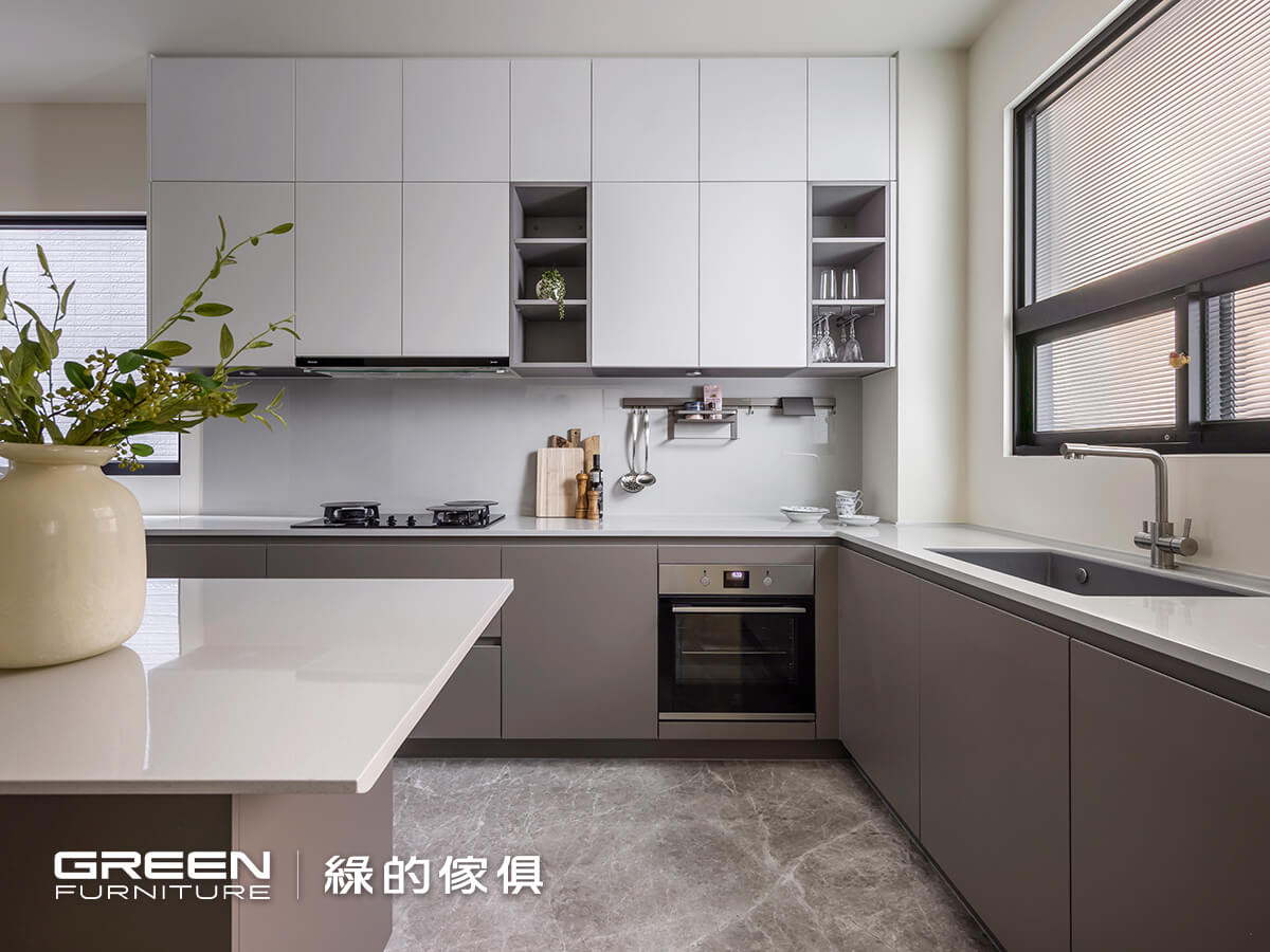- 系統板材選用:亞麻灰、陶烤門片-奶白