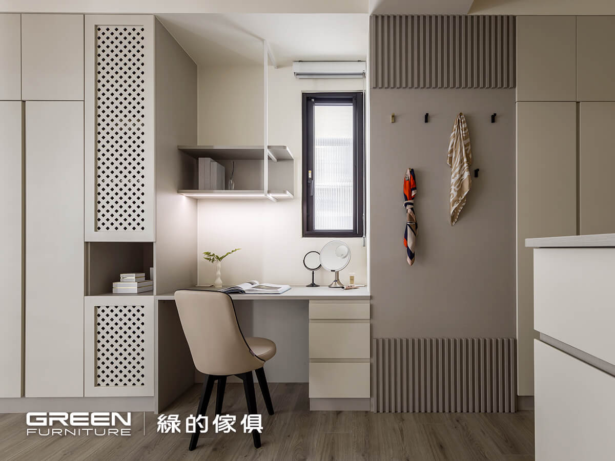 化妝台以俐落的白色線條搭配柔弧桌面,讓整體更顯輕盈,卻保留主角般的存在。收納規劃則維持綠的傢俱一貫的細緻度:造型掛鉤能優雅收放絲巾與日常小物,衣櫃門片加入透氣造型,不僅更適合精品包的保存,也替主臥增加一層溫柔的設計節奏。