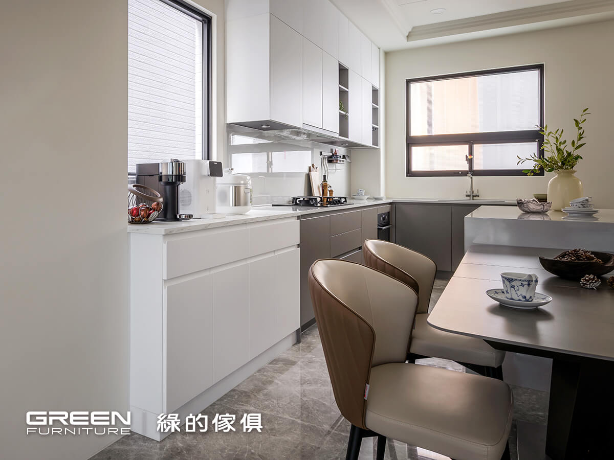 開放式的 ㄇ 字型廚房格局,使餐廳與廚房之間無隔牆劃分,一筆串起料理與用餐動線順暢連結,日常使用自在又方便。因顧及建商原廚具色調偏深,設計師於餐區搭配一組深淺對比強烈的餐櫃,利用輕淺木紋與霧面門片相互對話,創造出整體空間的視覺焦點。餐櫃不僅具備高機能的電器收納空間,並結合開放格櫃設計,大幅提升日常使用器皿的便利度,亦可將食器作為美好裝飾自在陳列。整體設計藉由材質、色彩與層次交錯鋪陳,在寧靜調性中加入亮點,也為日常餐桌時光增添溫度與風格。