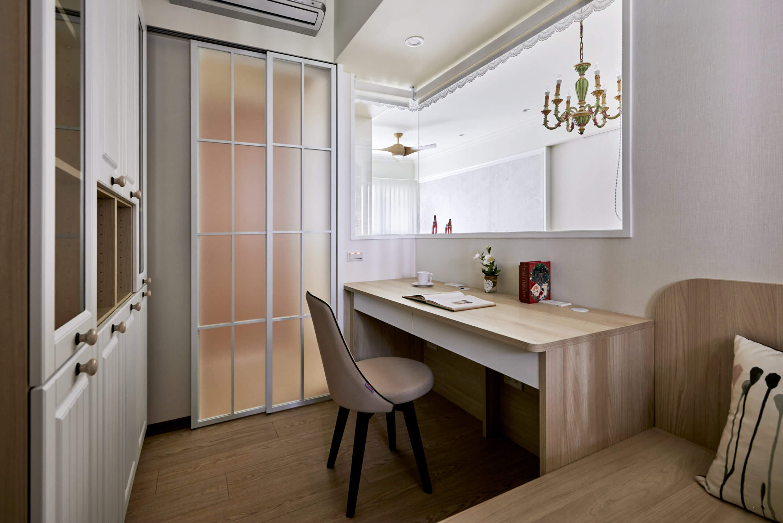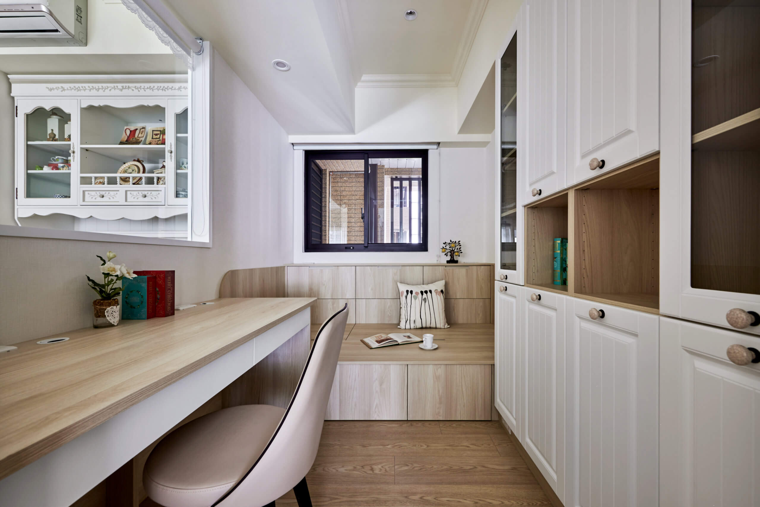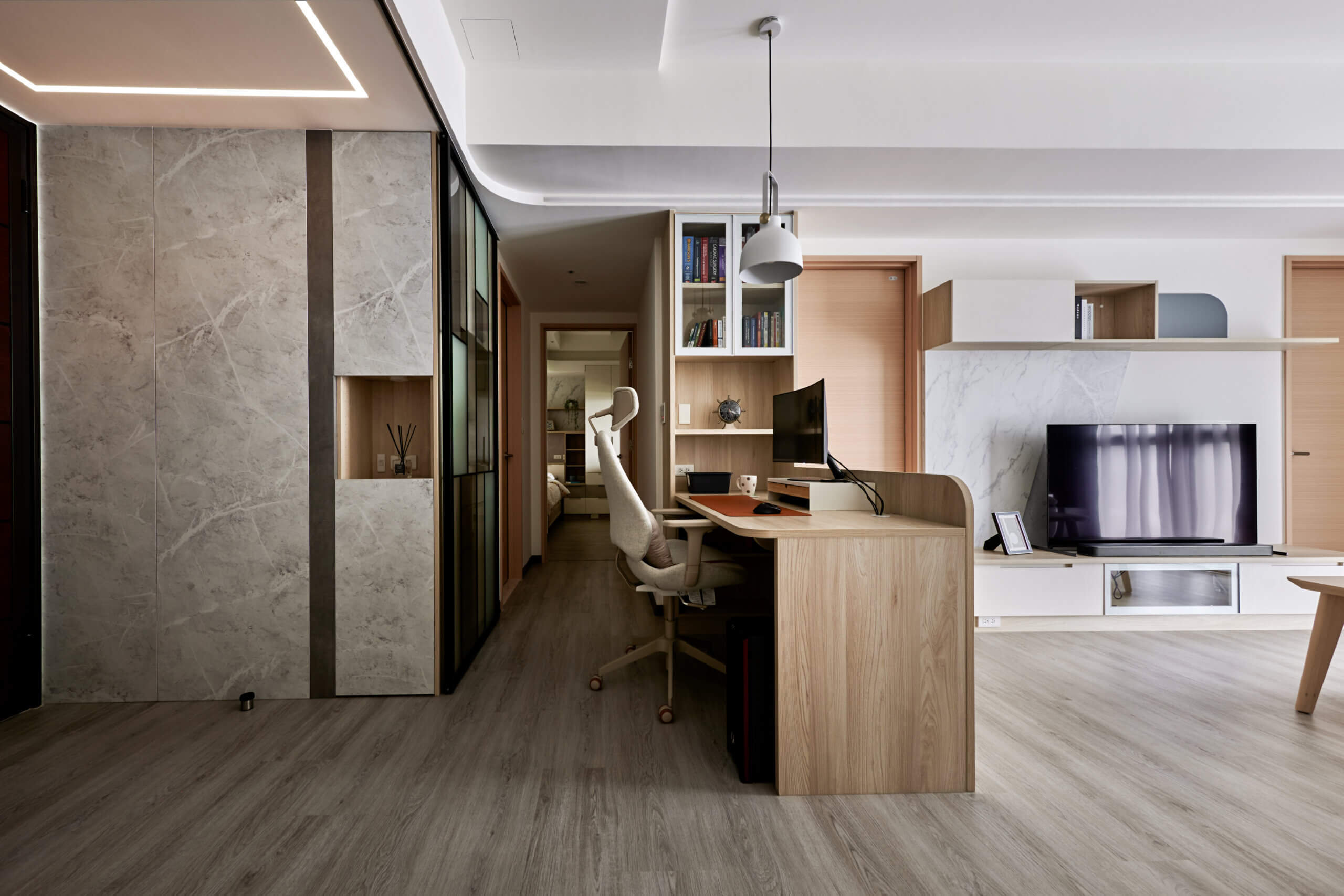 ▲本案因女主人常有在家工作的需求,格外講究專注平靜的氛圍,因此利用「波爾櫻系統板材」做為主調,同時妥善配置事務機、文件等相關物品,維持簡單清爽氛圍。