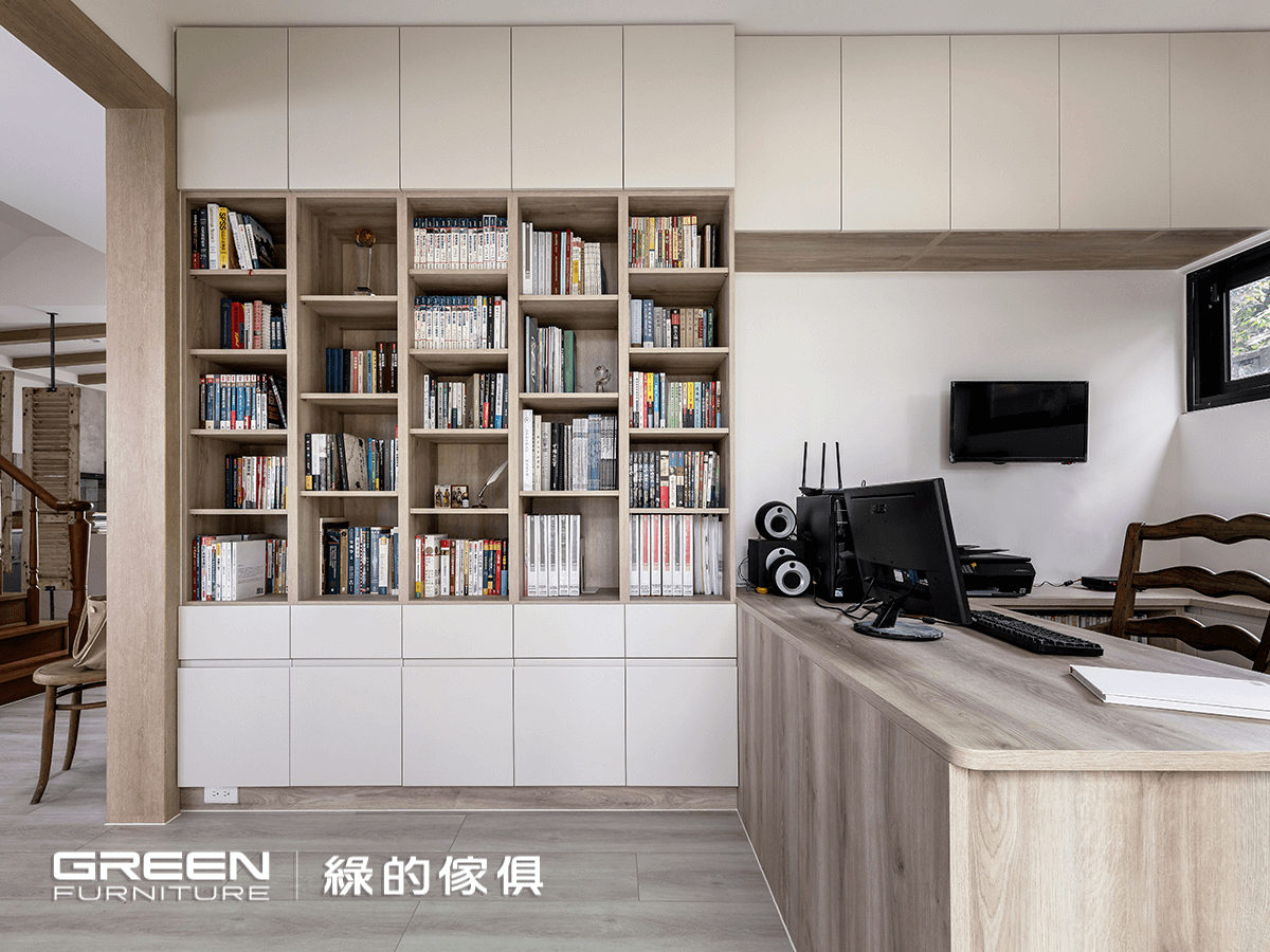 ▲本案因男主人工作緣故,常有在家視訊會議或面對面討論公事的需求,加上擁有大量藏書,因此將檯面加寬至 80 公分、書櫃深度拓增至 45 公分,有效增加收納量。
