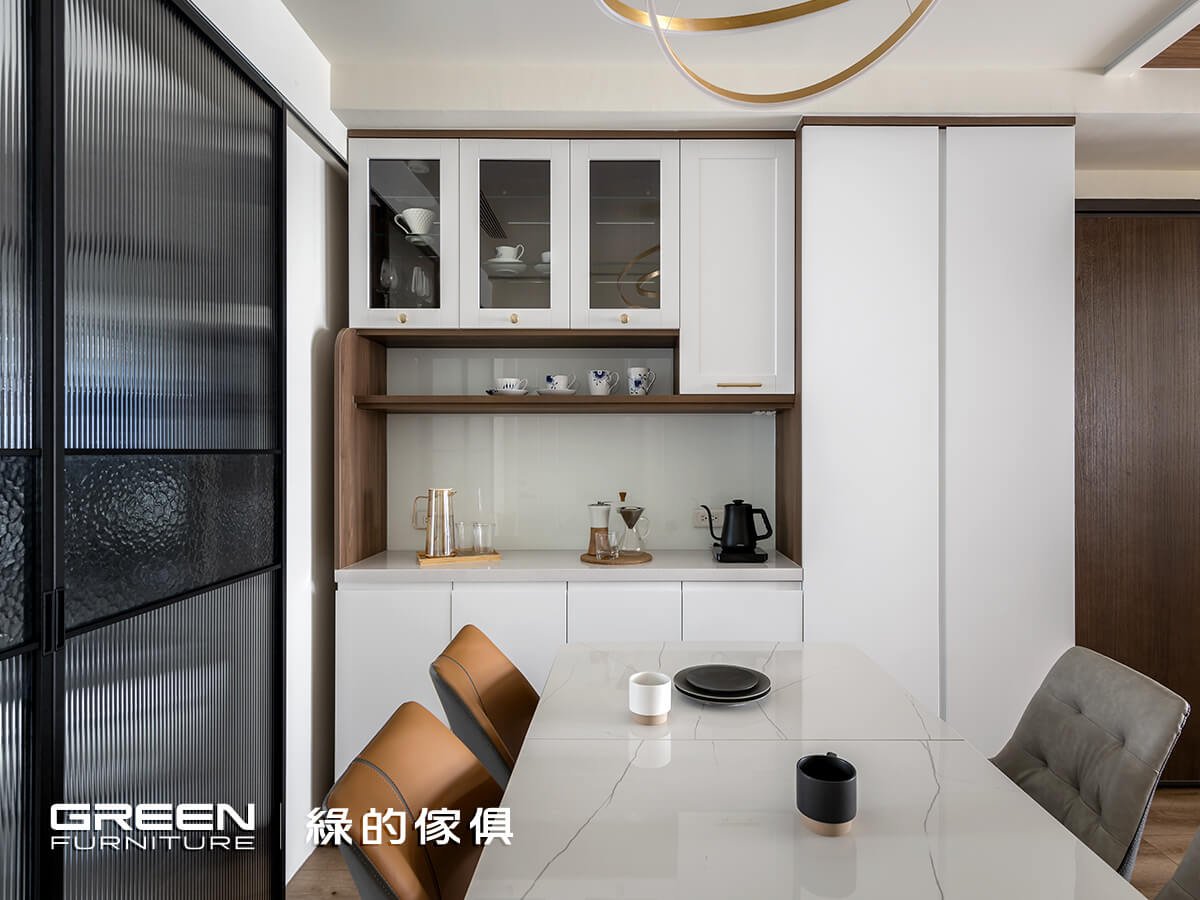 ▲白色木紋系統櫃多了些參差的線條;以同色系玻璃櫃,為空間帶來透視感
