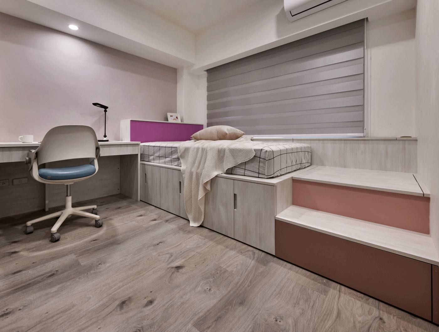 同時也可針對使用習慣,從床頭櫃循序延伸出書桌或是衣櫃,以一氣呵成的設計將臥室機能流暢串連,打造平衡協調的畫面,而櫃體本身亦可增加細微點綴,大大降低視覺負擔。與此同時,地台床也不失為一種好選擇,將收納隱於無形,使坪效倍增!