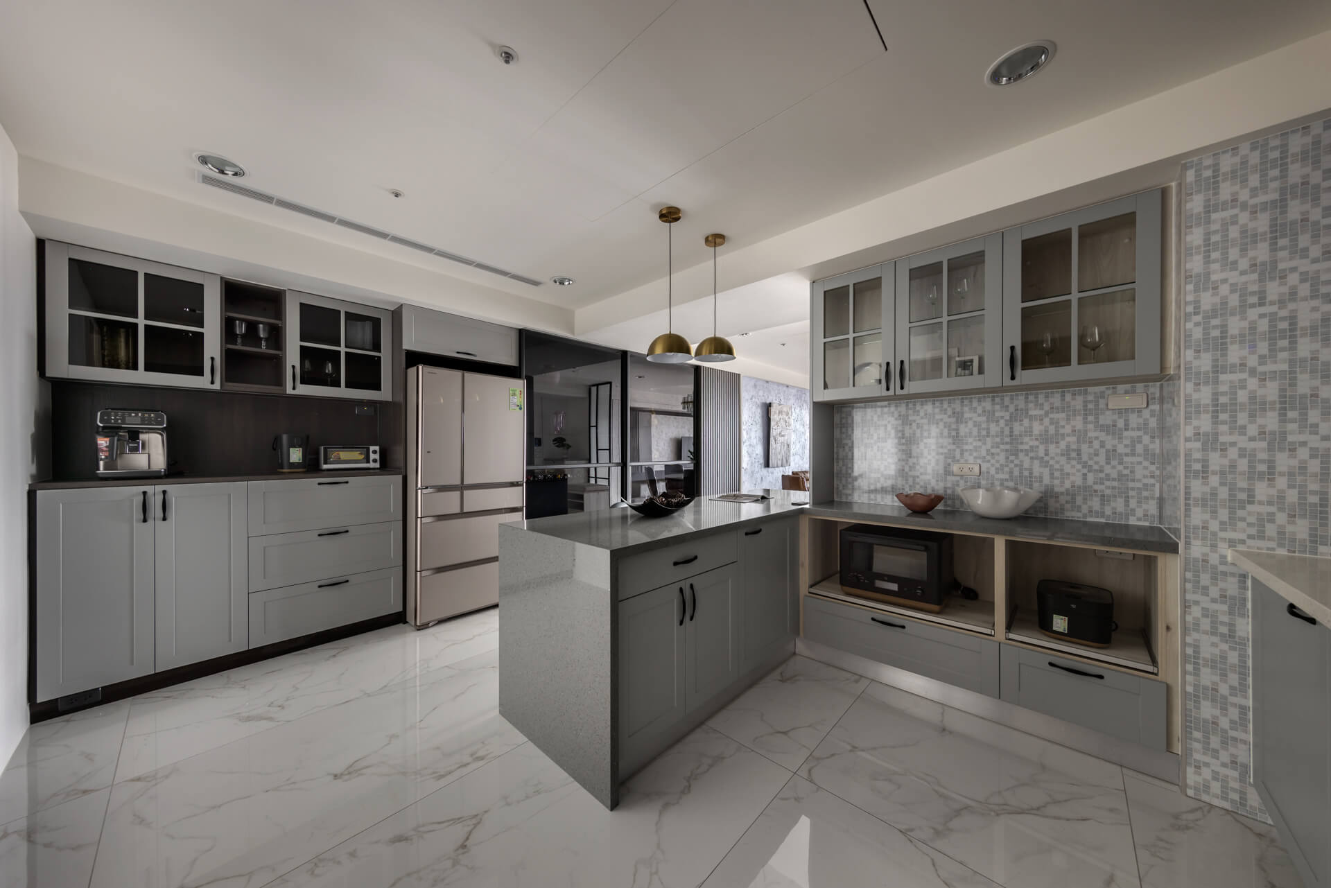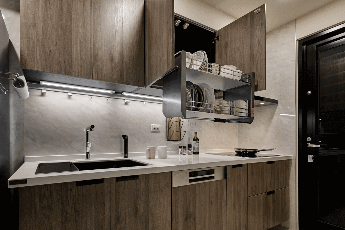 - 吊櫃:適合放置備品、乾貨或使用頻率較低的器具,建議搭配緩衝下拉式的升降櫃,使用更安全省力。
