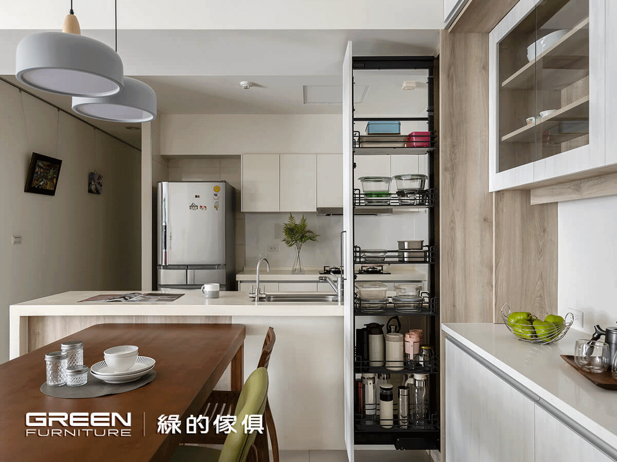 - 側拉櫃:深櫃好取物的神器,像是醬料罐、備料小物一目了然,不再翻箱倒櫃。