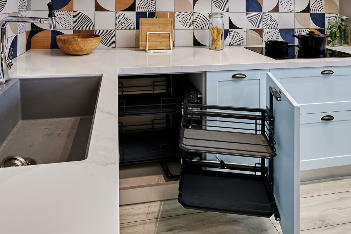 - 轉角小怪物:專為轉角櫃打造的拉籃系統,一拉到底、收納清楚,解決邊角櫃難拿又浪費的痛點,特別適合放鍋具與大型備品,小坪數也能不留死角。