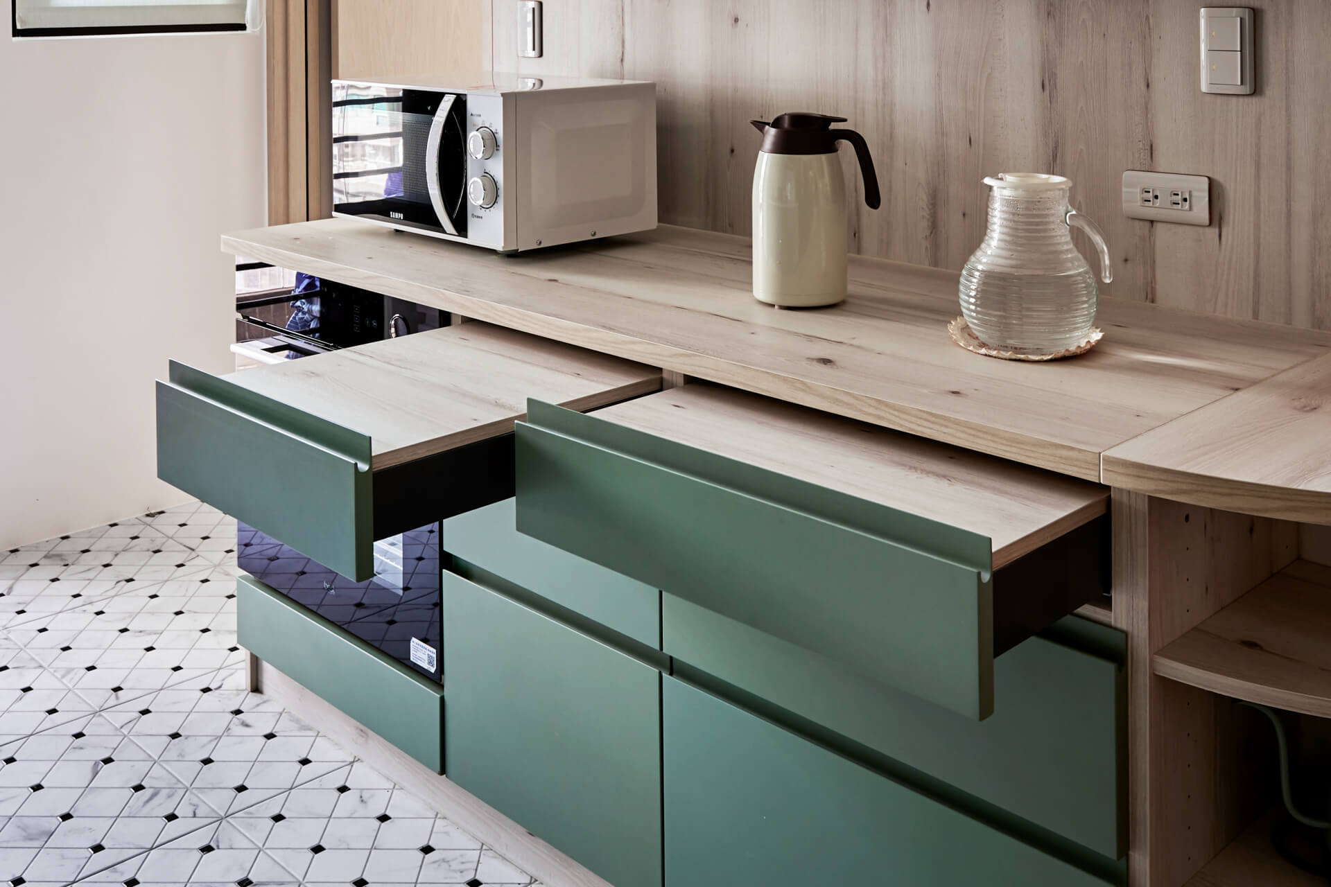 - 抽拉盤:能從櫃體中拉出暫時使用,除收納功能外,也可當作延伸工作檯面,提供備料、放置器皿等彈性空間,特別適合小坪數廚房提升操作效率。