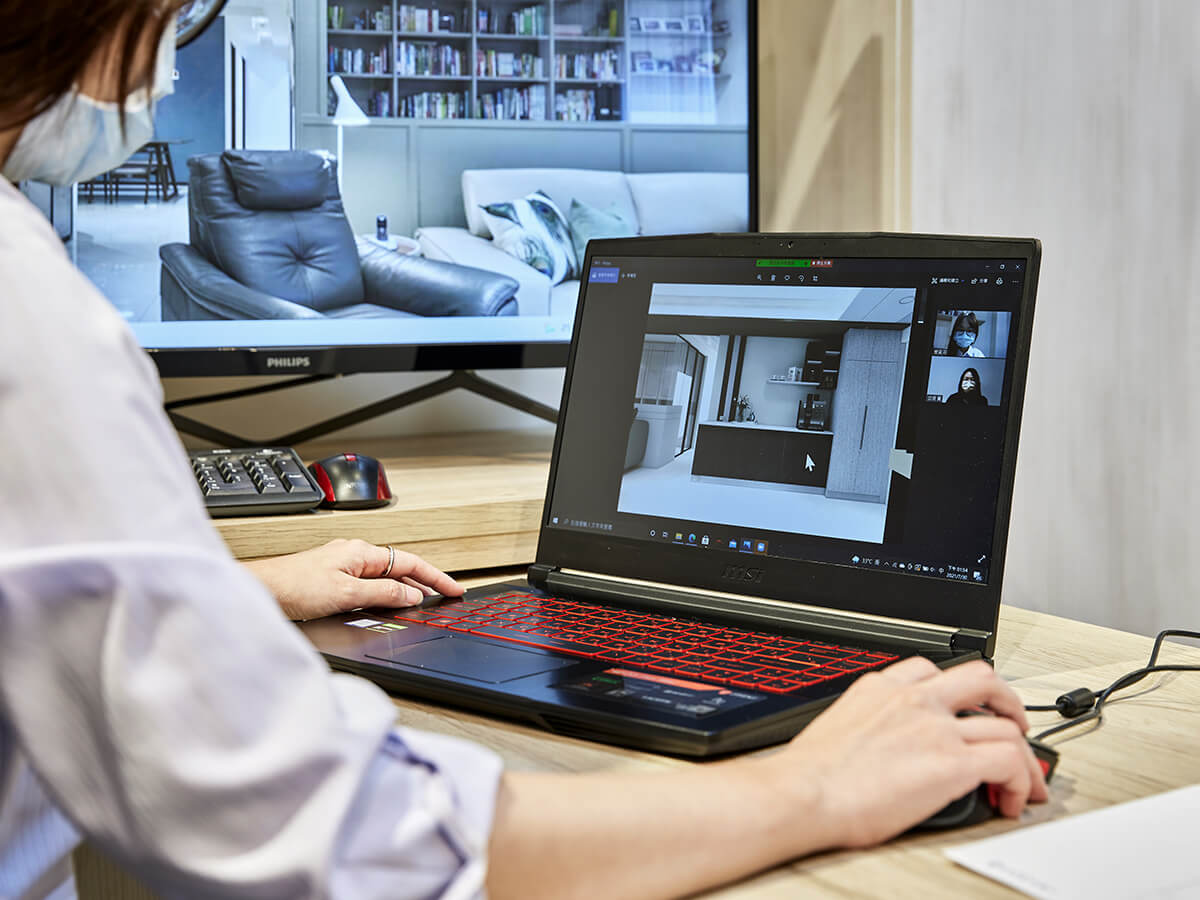 消費者可先在網路上尋找相關資訊,再上線與綠的傢俱客服進行諮詢,使用Line、Google Meet、Zoom等軟體進行討論,不僅可線上看圖、談圖、簽約,甚至連親至施工現場也不用,可由綠的傢俱團隊協助監工。「幾乎高達9成的環節都可在線上進行,消費者只要驗收完成就可入住,因此客戶接受度很高。」