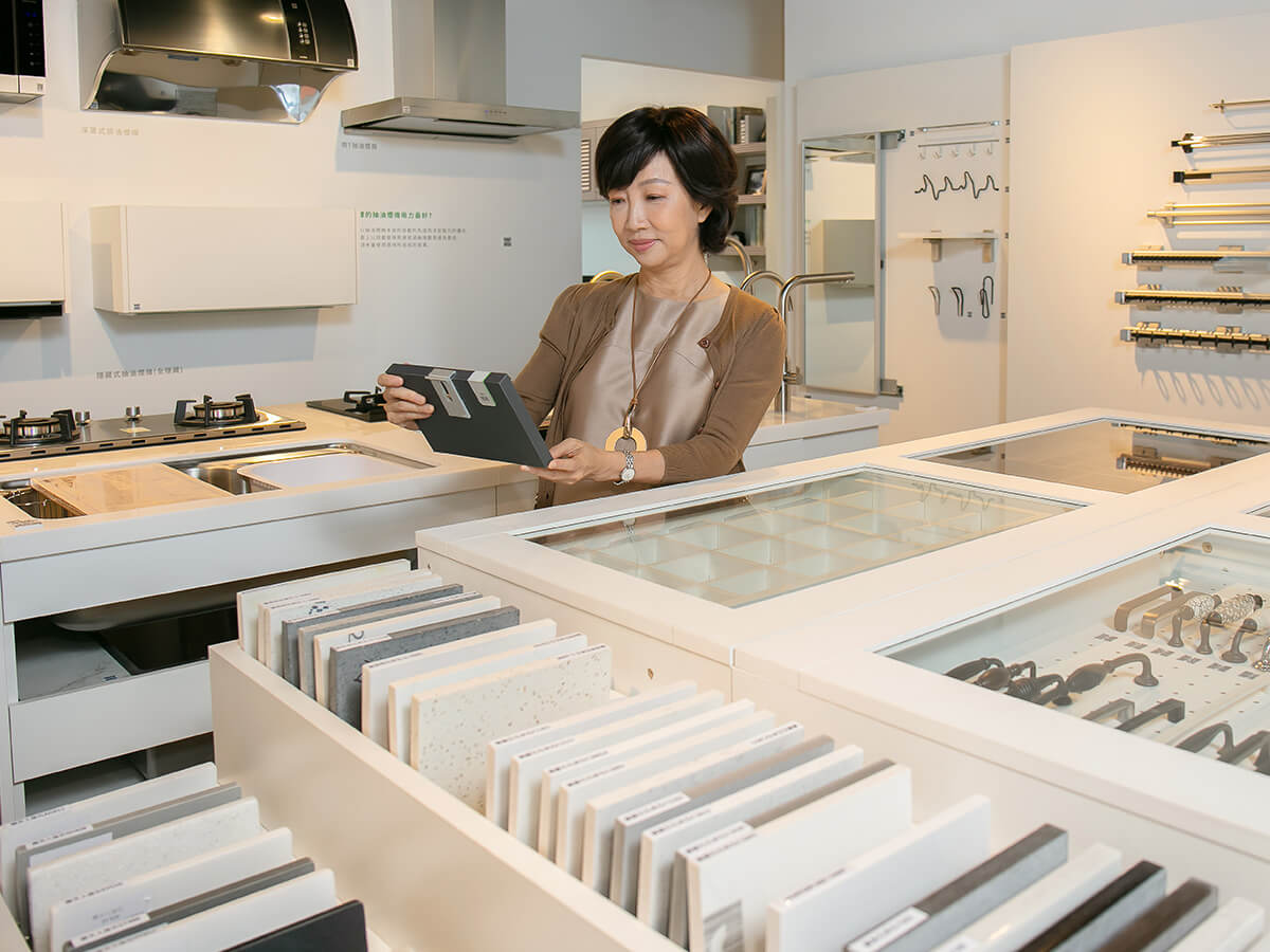 實際造訪過綠的傢俱,丁菱娟便分享自己對於能夠真實觸摸及感受的「3.0版體驗式選材區」驚喜發現,「對想要擁有自己專屬美麗又舒適廚房的人,這裡便提供了不同風格的設計搭配組合,讓人能夠依據收納、料理方式可規劃出合適的空間,像是料理方式多為中式料理,以獨立廚房區域為主、輕食料理則可做開放廚房。」而另外像是一般人易忽略的五金、門片鉸鍊、門把、抽屜及拉籃的滑軌等零件,綠的傢俱不僅一應俱全,一一陳列在客製化選材區,還提供永久保固的服務,讓消費者用得更加安心!