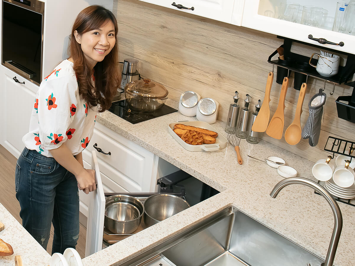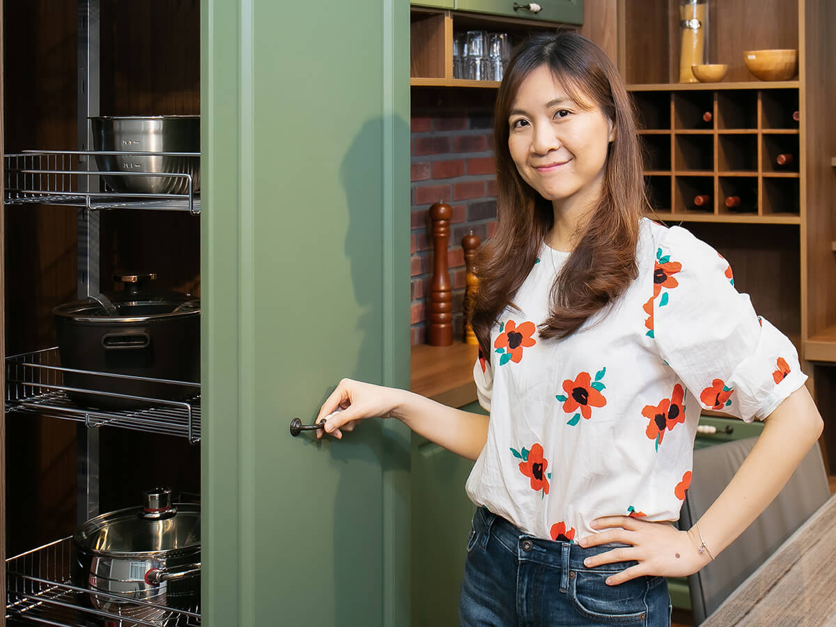 她表示,面對廚房裡的瓶瓶罐罐、鍋碗瓢盆等,「許多人都容易有收納困難症,但只要選對廚房配件,其實就非常容易,像是系統櫃就是非常好的幫手!」