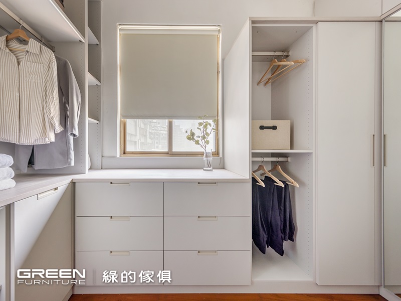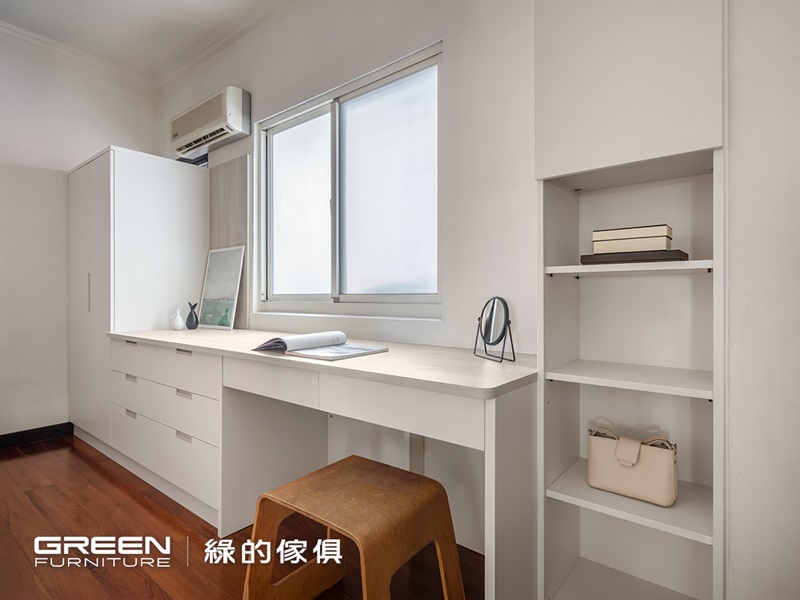 我對綠的傢俱的認識,源自擔任《綠的30》專刊編輯顧問時的經驗,從門市到工廠、從設計師到顧客,見證他們在規劃、施工與售後服務上的用心。這次,綠的設計師到府丈量,針對女兒房新增衣櫃、書桌與收納櫃,更衣室則拆除舊櫃並擴充容量。