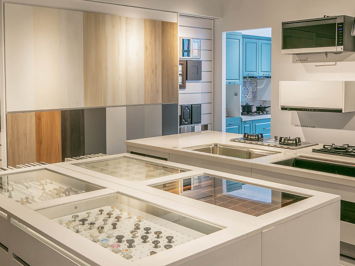 看似簡單有力的一句承諾,背後隱藏的學問及堆疊的細節用心卻是相當驚人,單以這個業界首創將門市內陳列體驗式選材區為例,透過專屬區域的規劃,將進口系統板材與五金配件等全面排列展示,讓消費者不必透過圖面或影像憑空想像,能直接觸摸板材做挑選,給予親臨體驗居家設計的服務過程,就有賴強大專業的後勤團隊支援。
