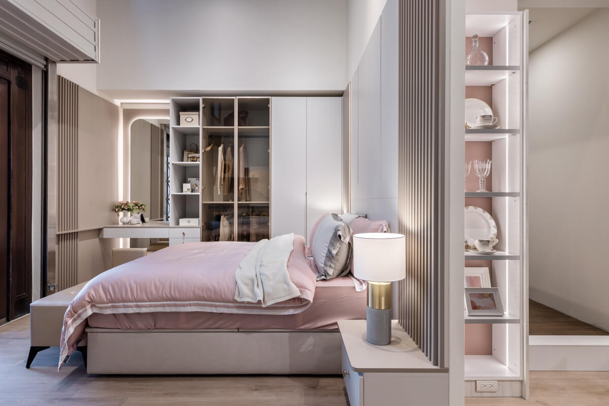 整組系統傢俱以「衣櫃 × 化妝台× 床頭牆」一體設計,