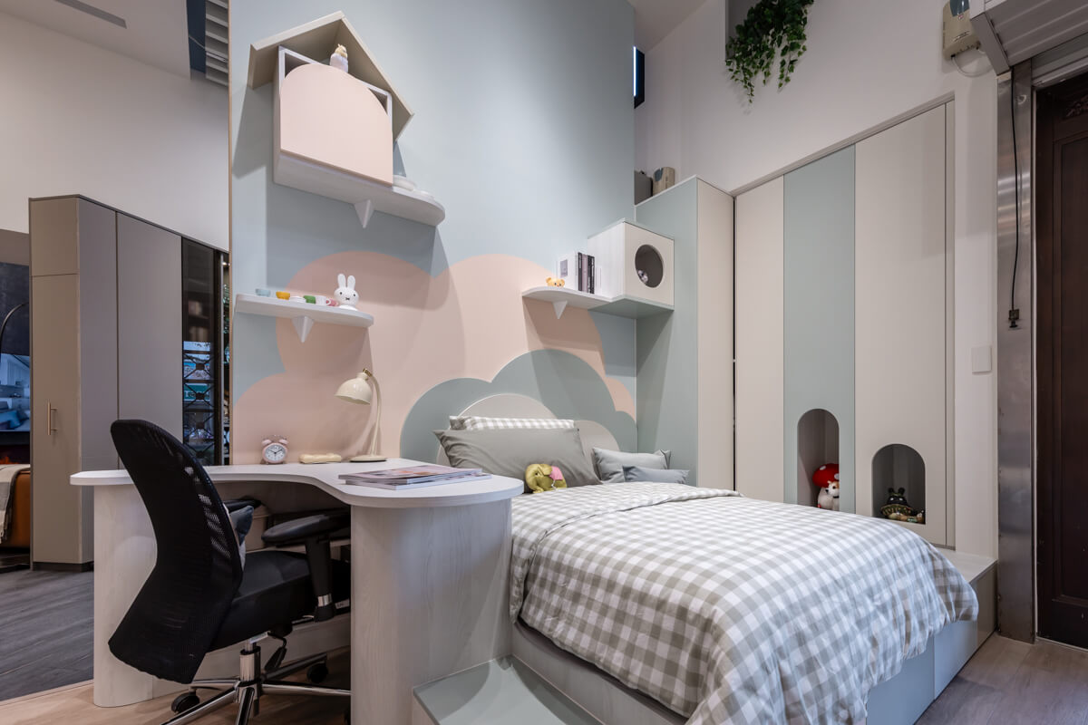 以霧藍與蜜桃粉為主調,牆面如輕柔的雲層,包裹著童年的想像。